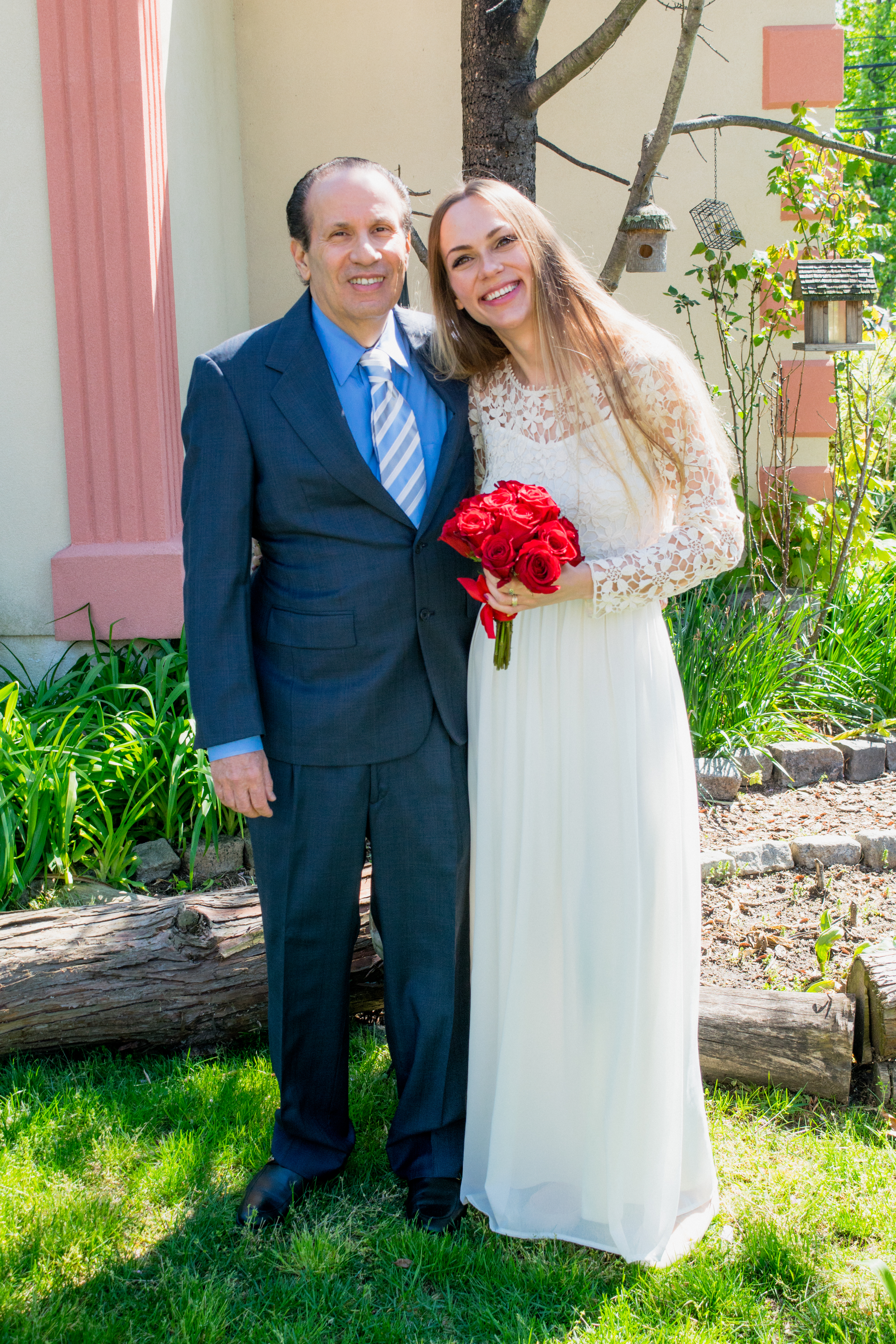 Painting of a man in a suit and a woman in a white lace dress holding red roses.
