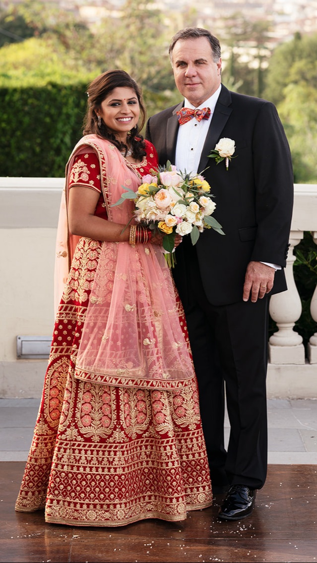 Painted portrait of a bride in a red and pink lengha and a groom in a black tuxedo, holding a bouquet of flowers.