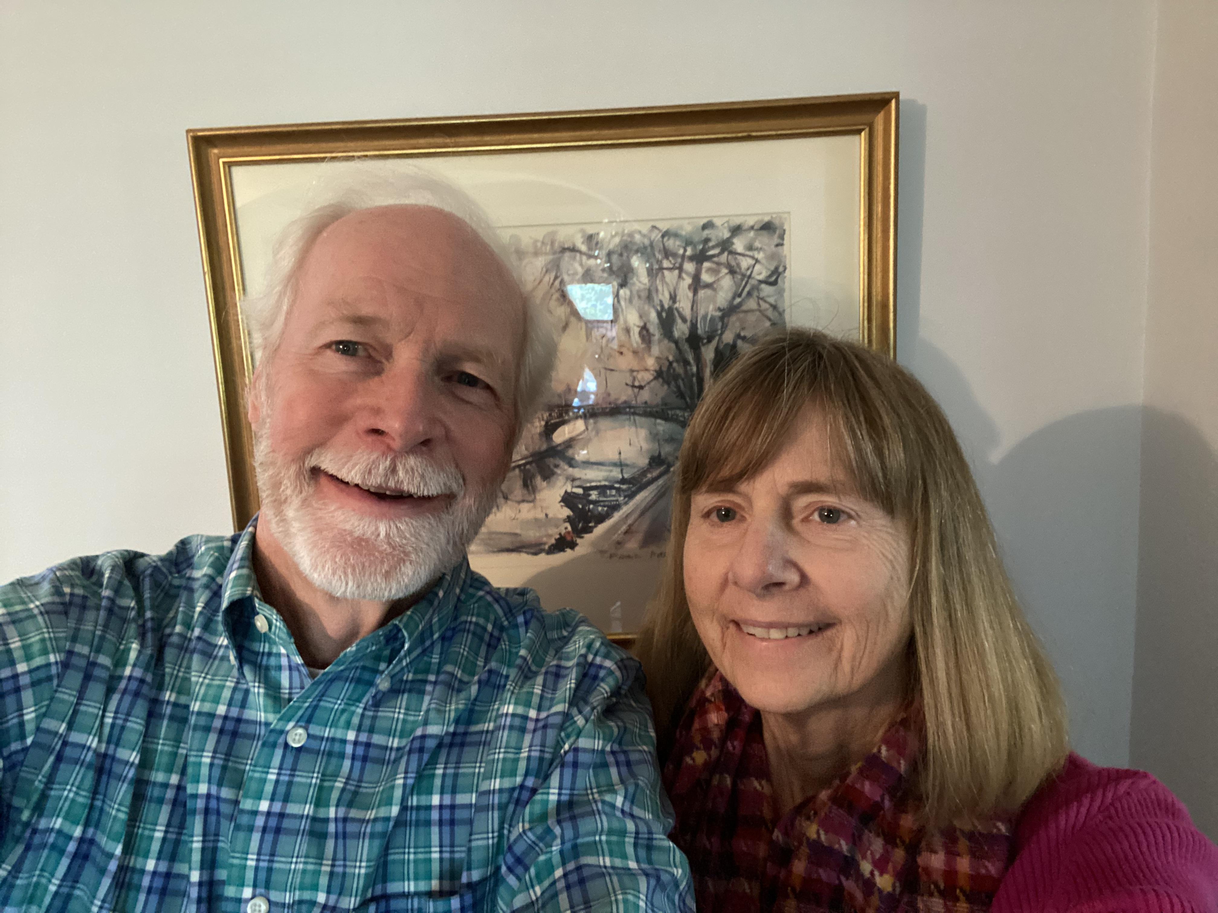 Painted portrait of a smiling older couple outdoors.