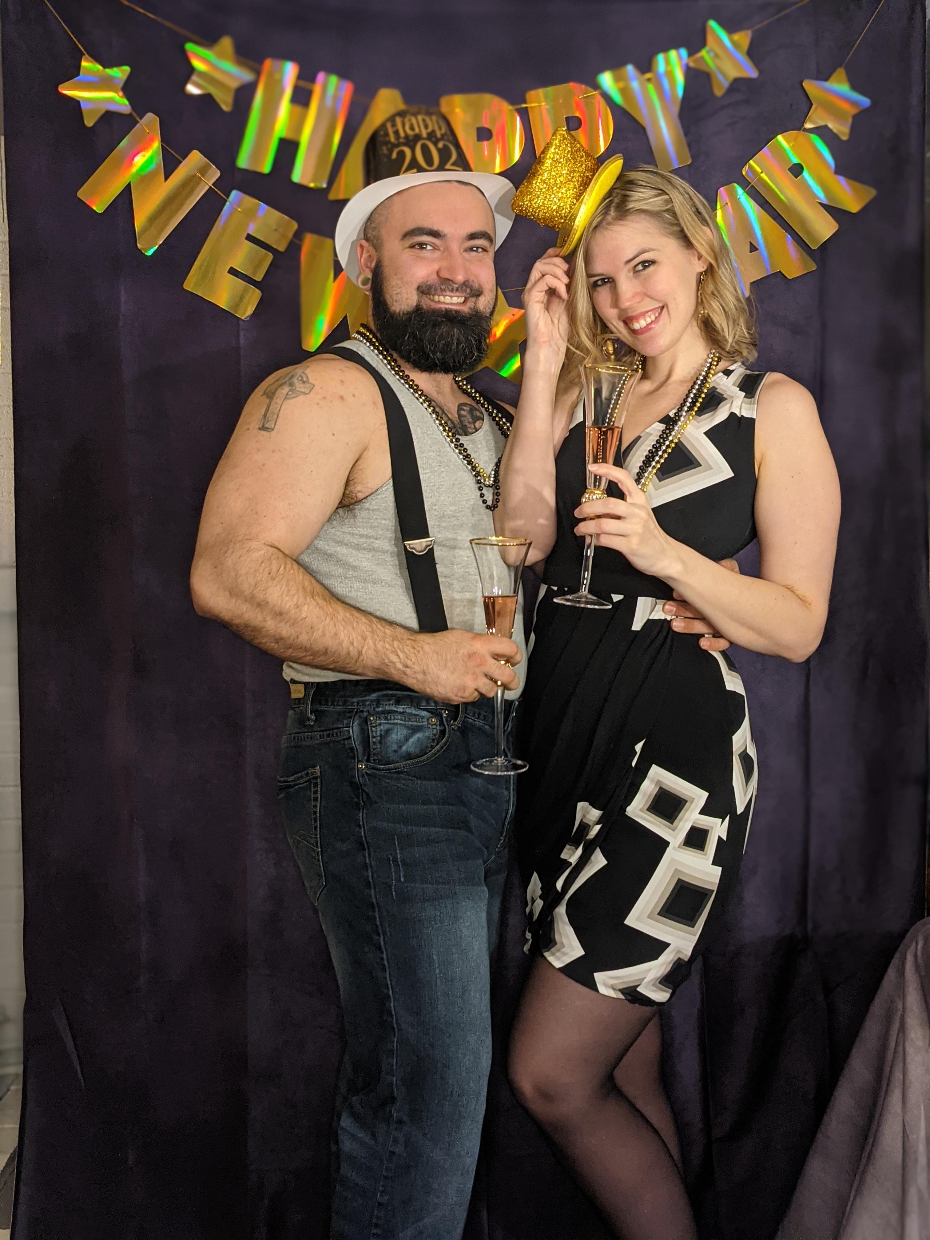 Painting of a couple celebrating New Year`s Eve.