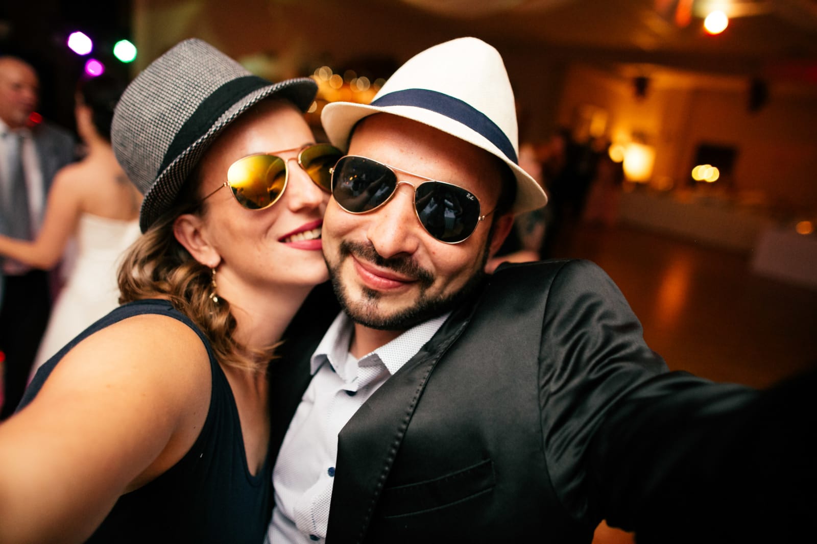 Painting of a couple wearing hats and sunglasses, woman kissing man on cheek.