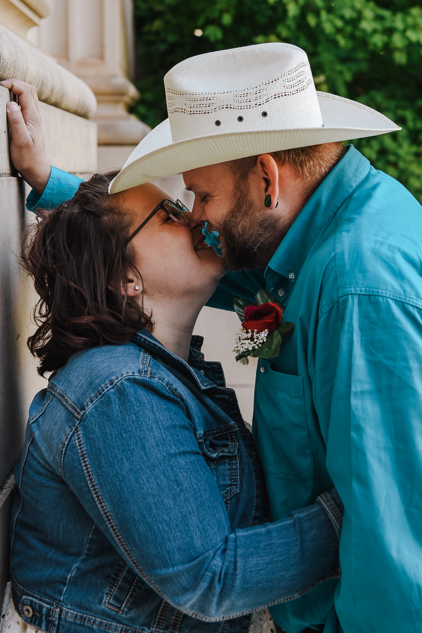 Painting of a couple kissing, the man wears a white cowboy hat and blue denim shirt, the woman wears glasses and a blue denim jacket.