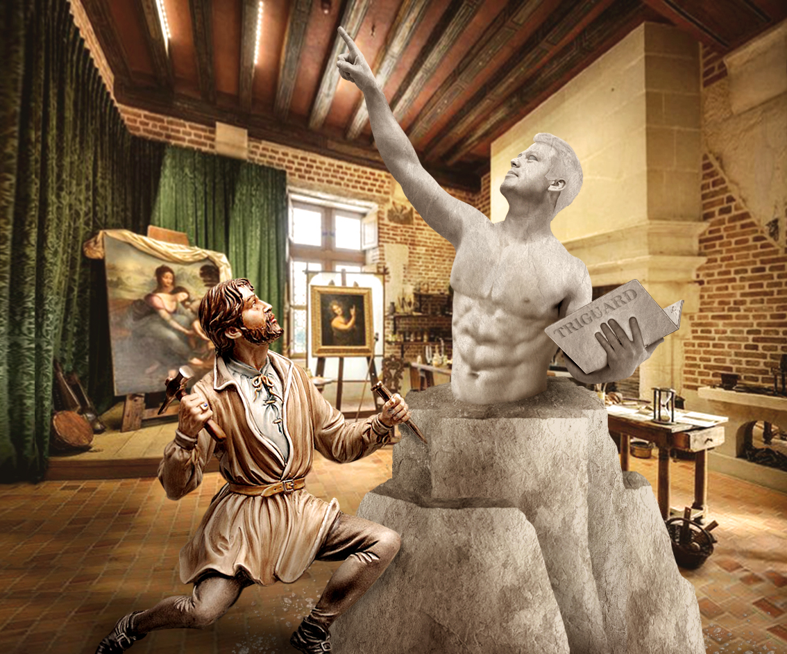 Sculptor chipping away at a stone statue of a muscular man holding a newspaper.