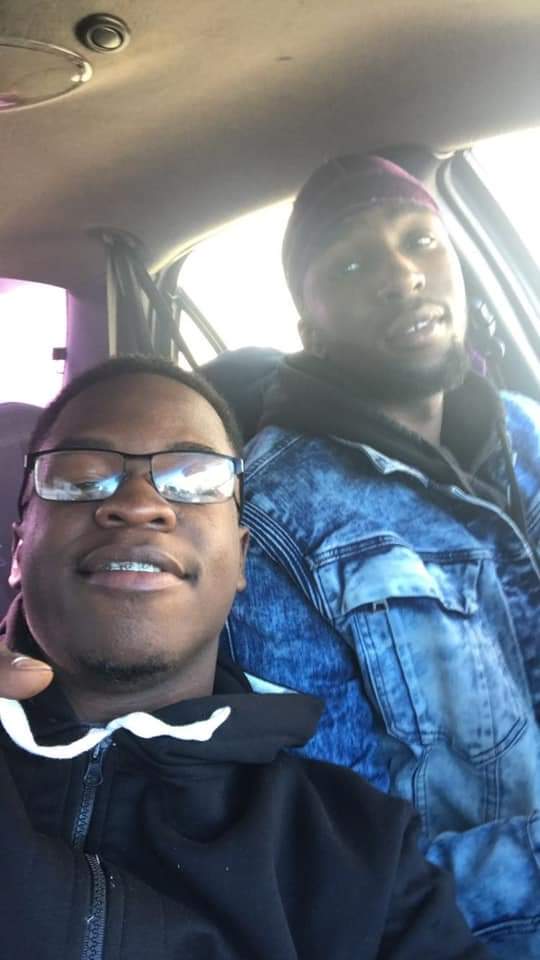 Painting of two Black men, one with locs and a dark hoodie, the other wearing glasses and a purple hoodie.