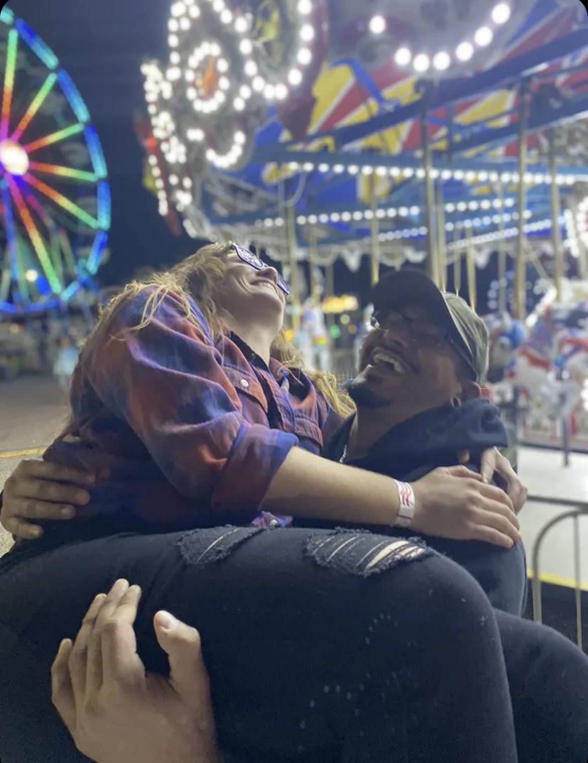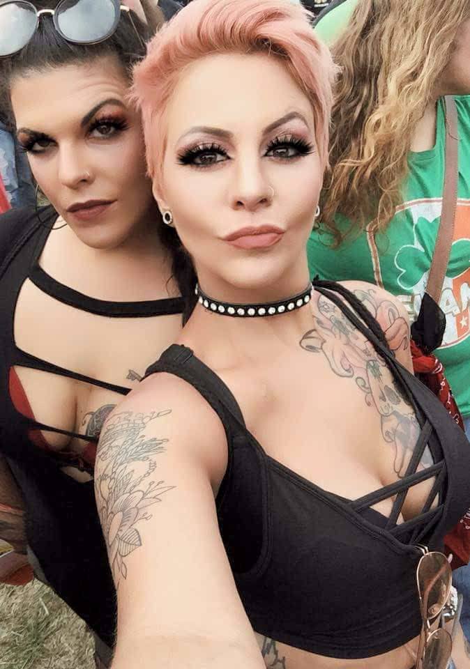 Painting of two women, one with short blond hair and tattoos, the other with dark hair and sunglasses.