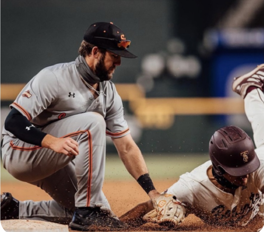 Painting of baseball players at the plate, one kneeling and one sliding into the base.