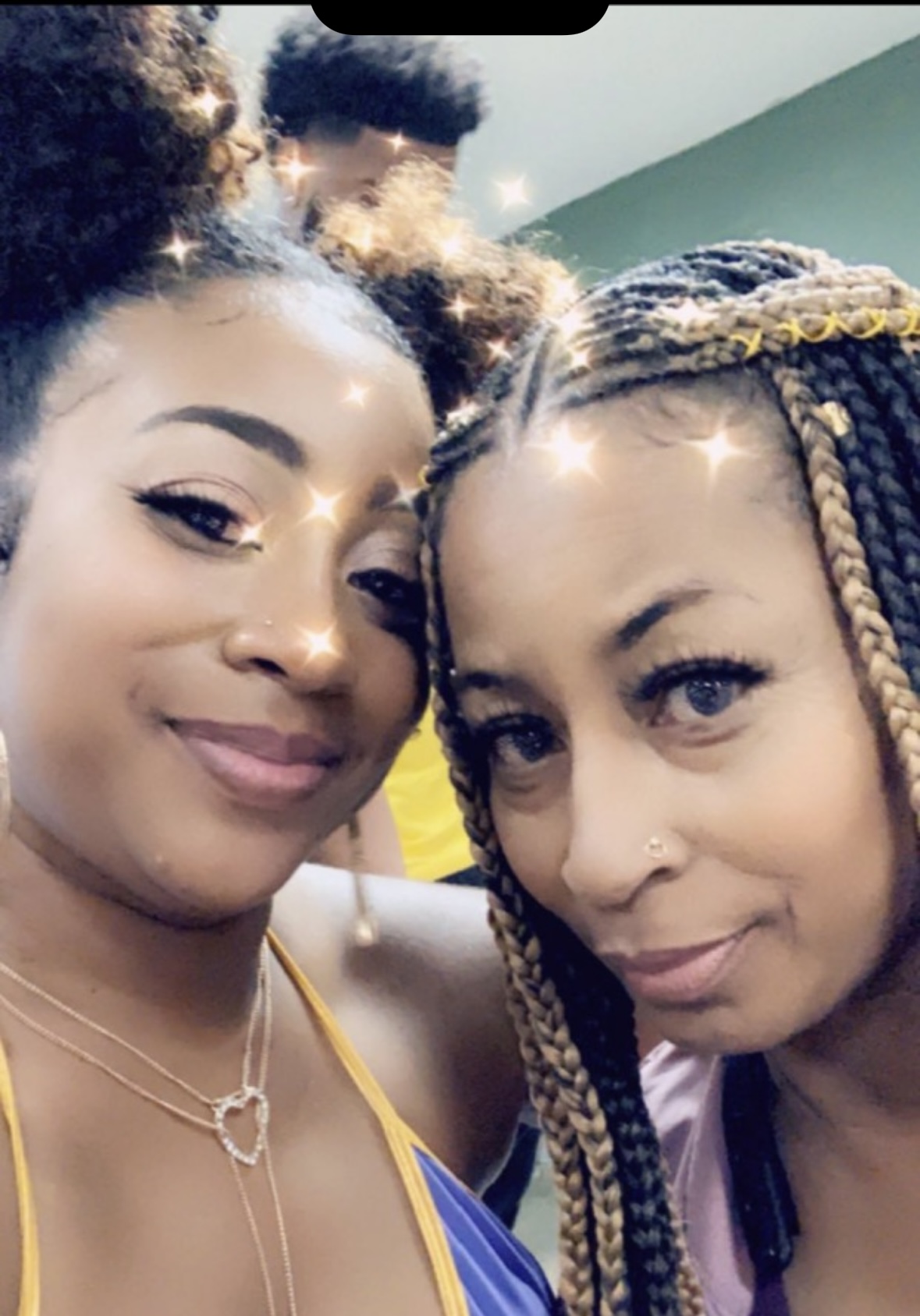 Painting of two Black women with halo, stars, and braids.
