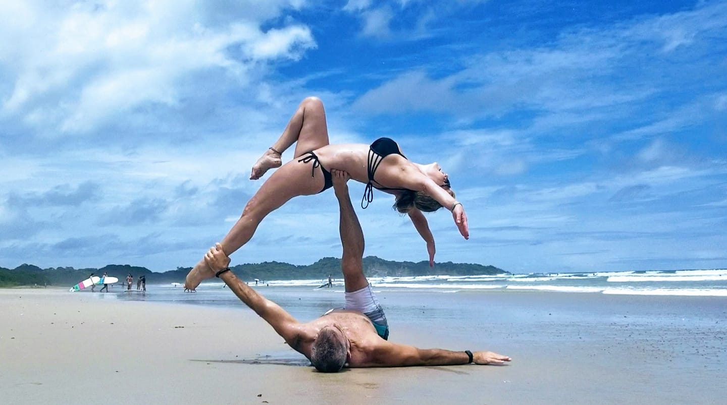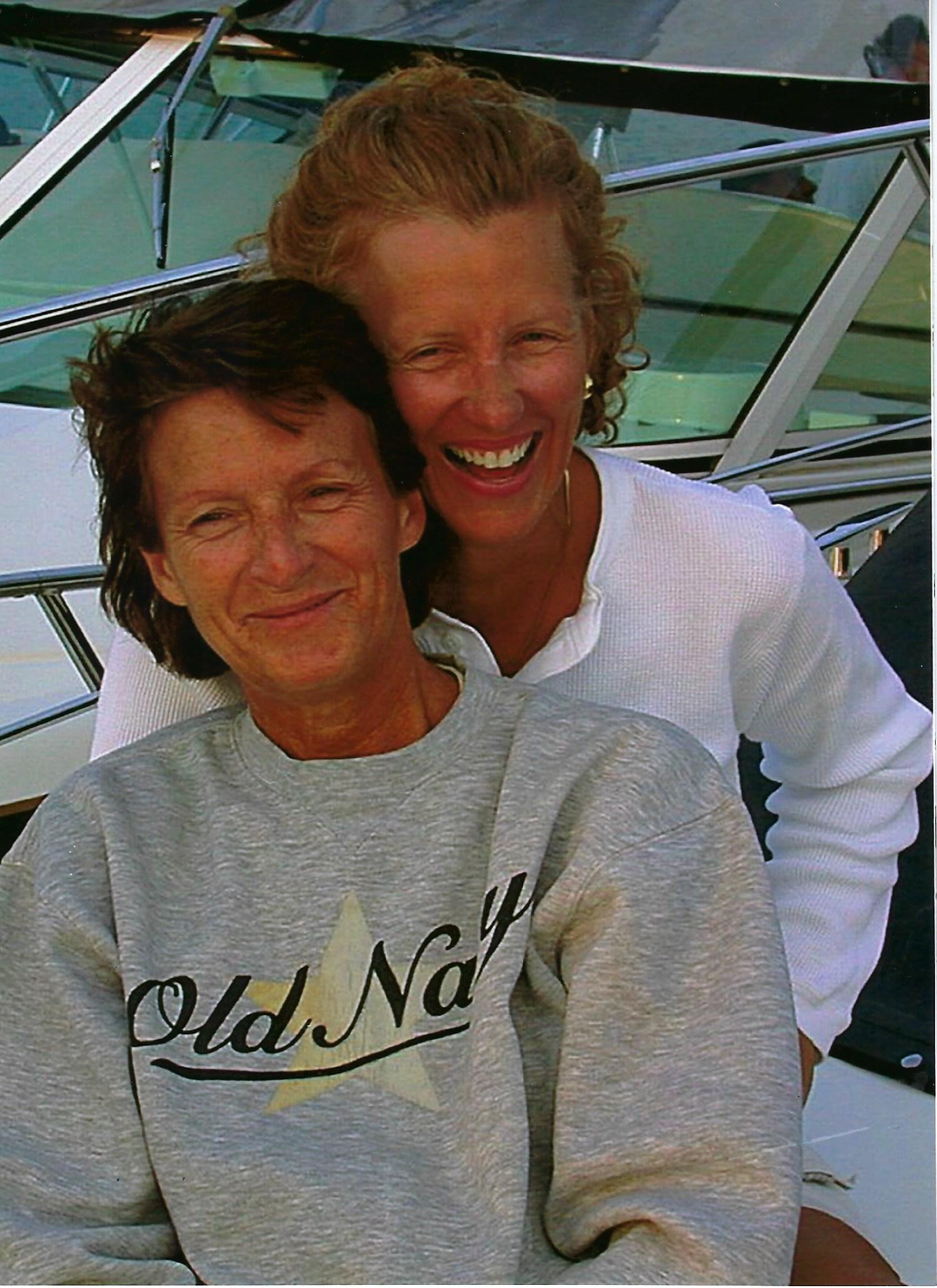 Painting of two smiling women near a boat, one wearing an Old Navy sweatshirt.
