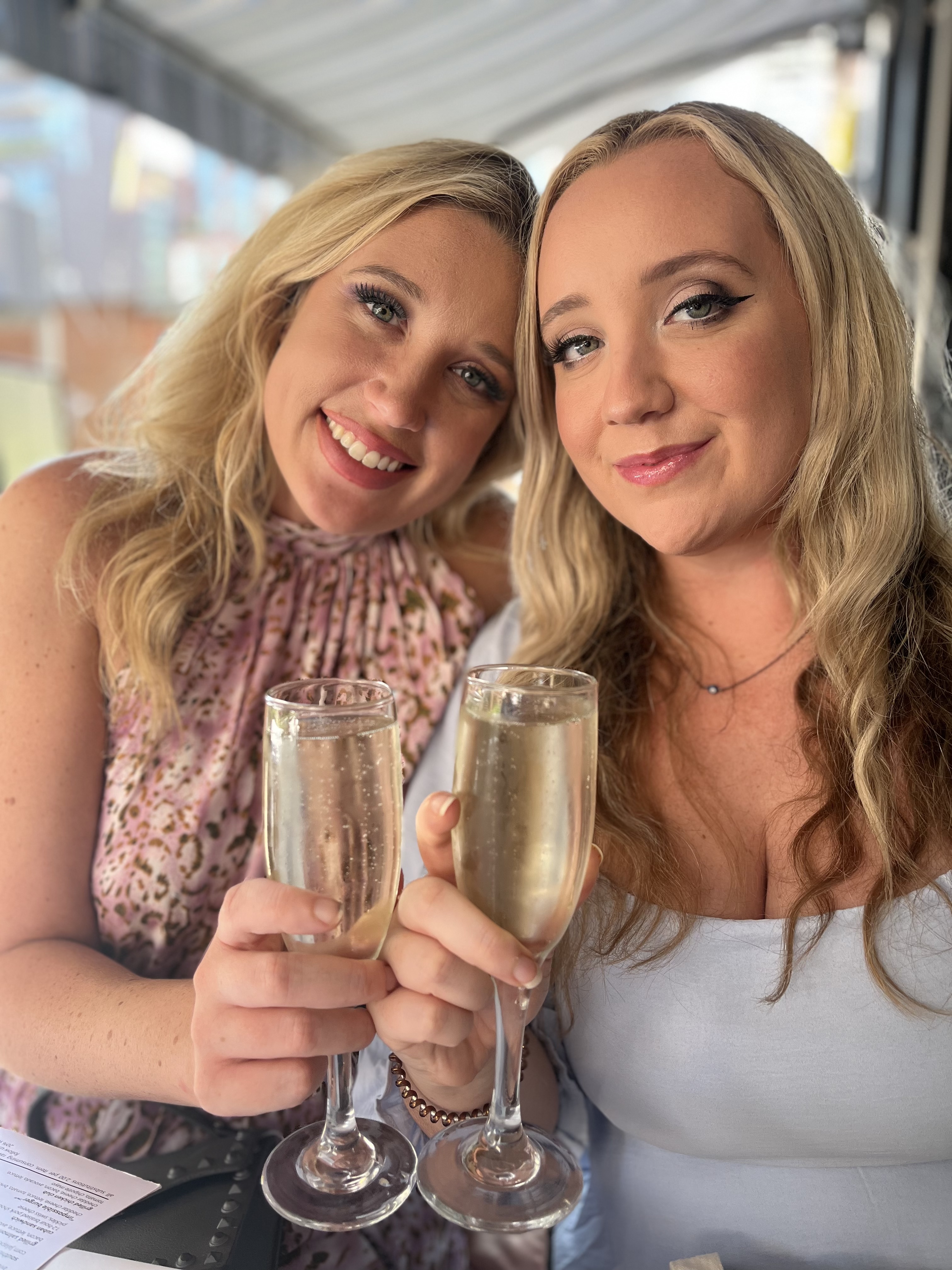 Painting of two blonde women toasting with champagne flutes.