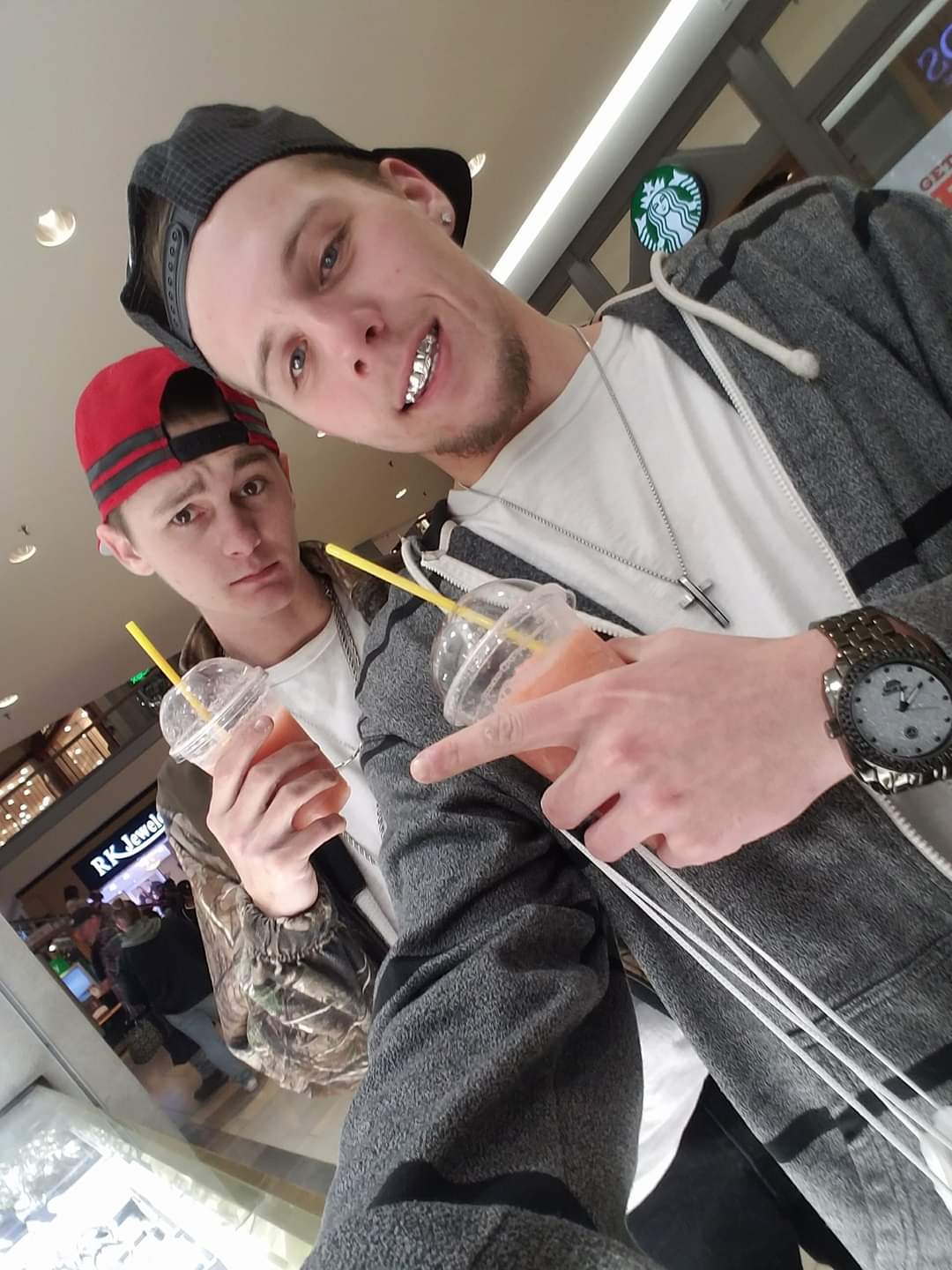 Painting of two young men in baseball caps holding drinks, selfie-style.