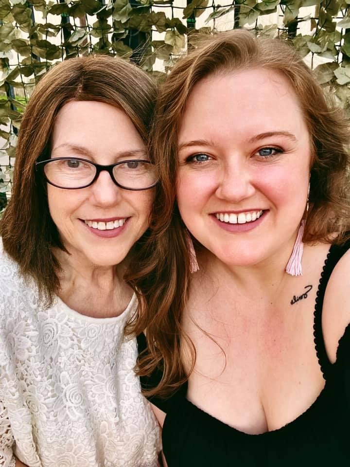 Painted portrait of a mother and daughter smiling.