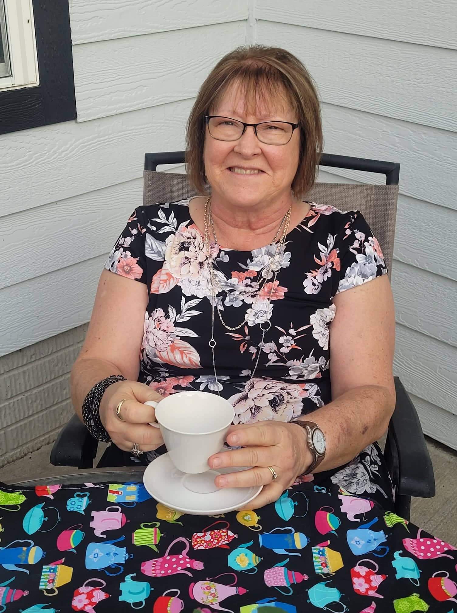 Painted portrait of two women, one wearing a wide-brimmed hat, the other in a floral dress, holding a teacup.