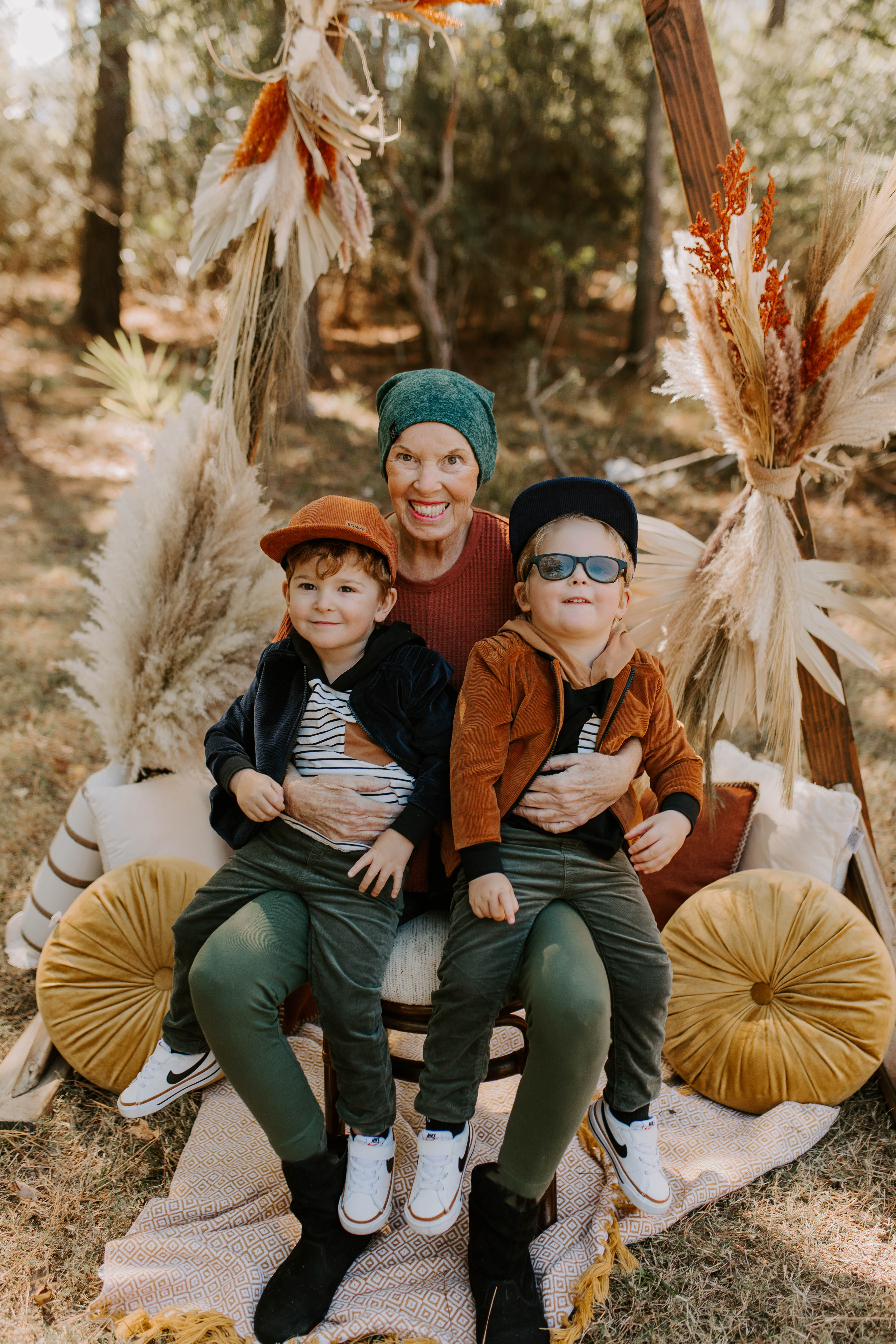 Painted portrait of a family: grandparents, three boys, and a girl.