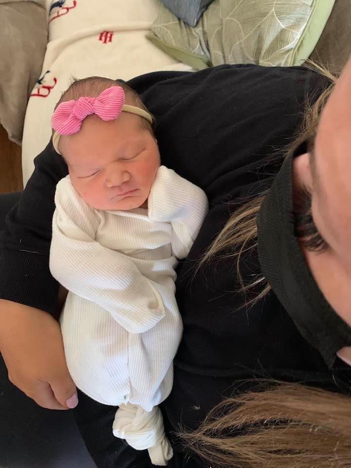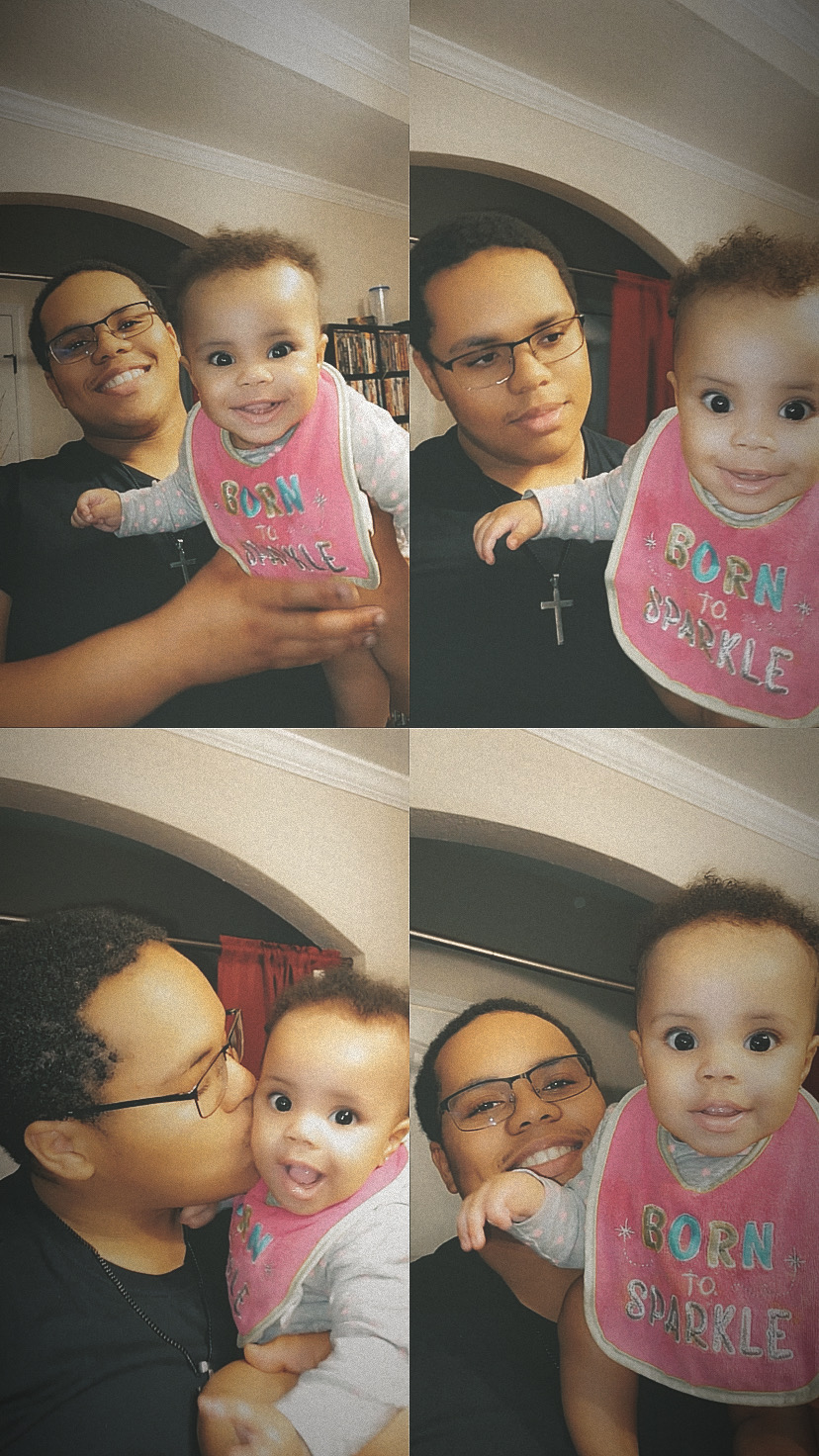 Painting of a man in a beanie and a toddler girl wearing a pink bow.
