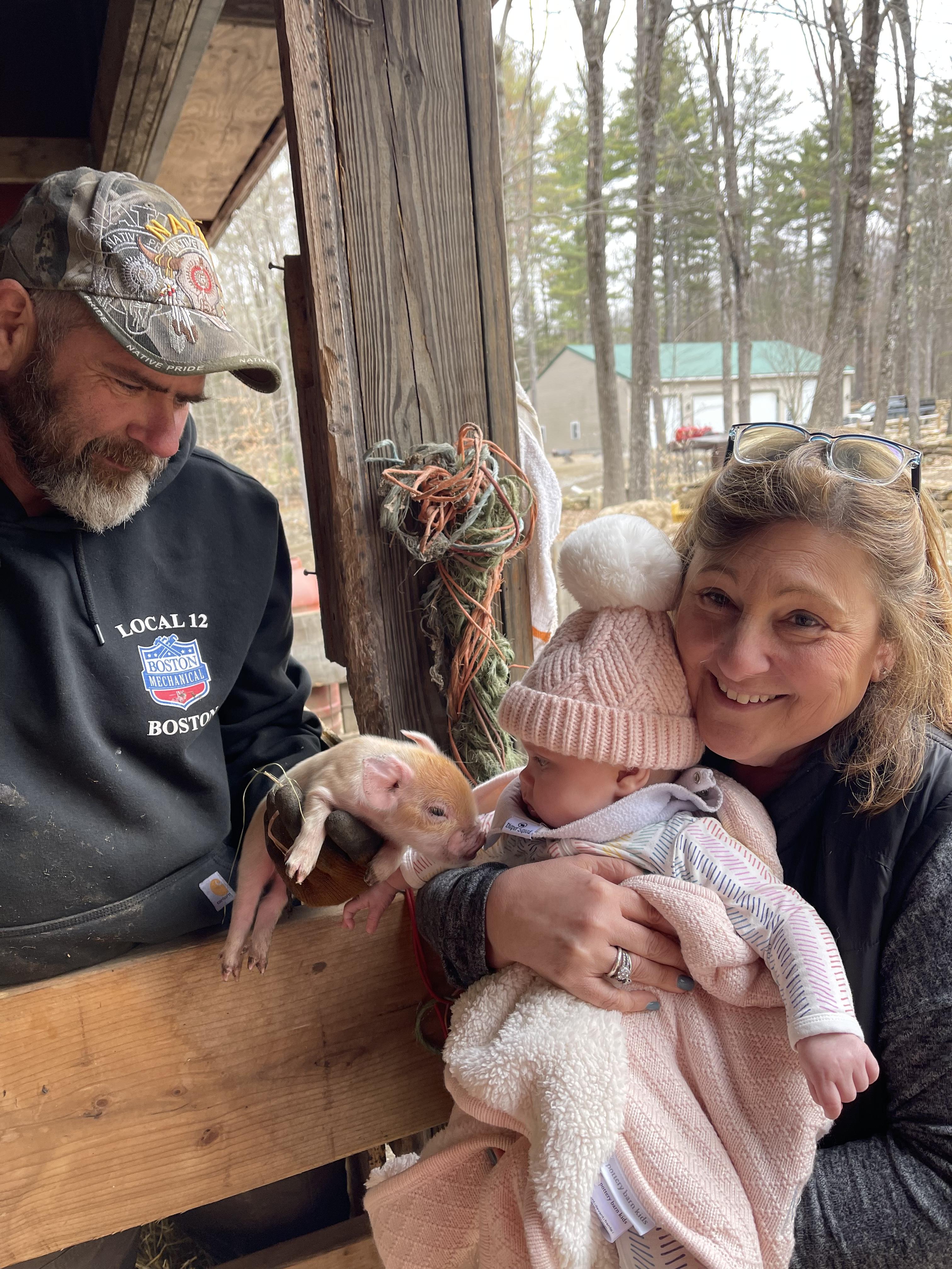 Painting of a family with a baby and a piglet.