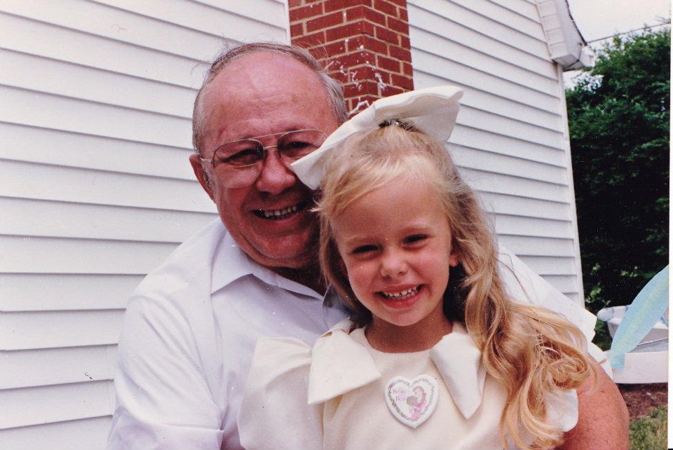 Painting of a grandfather and granddaughter smiling together.