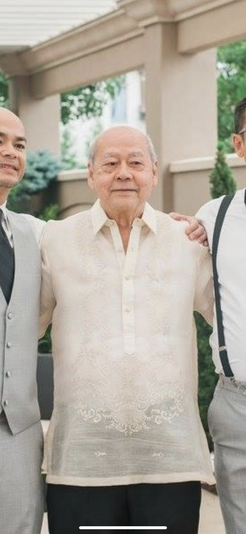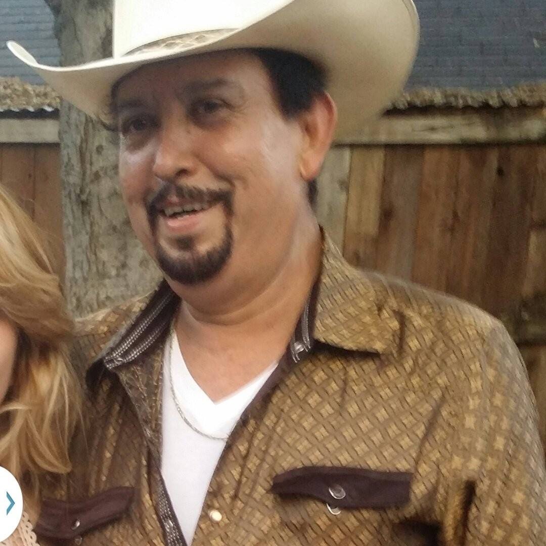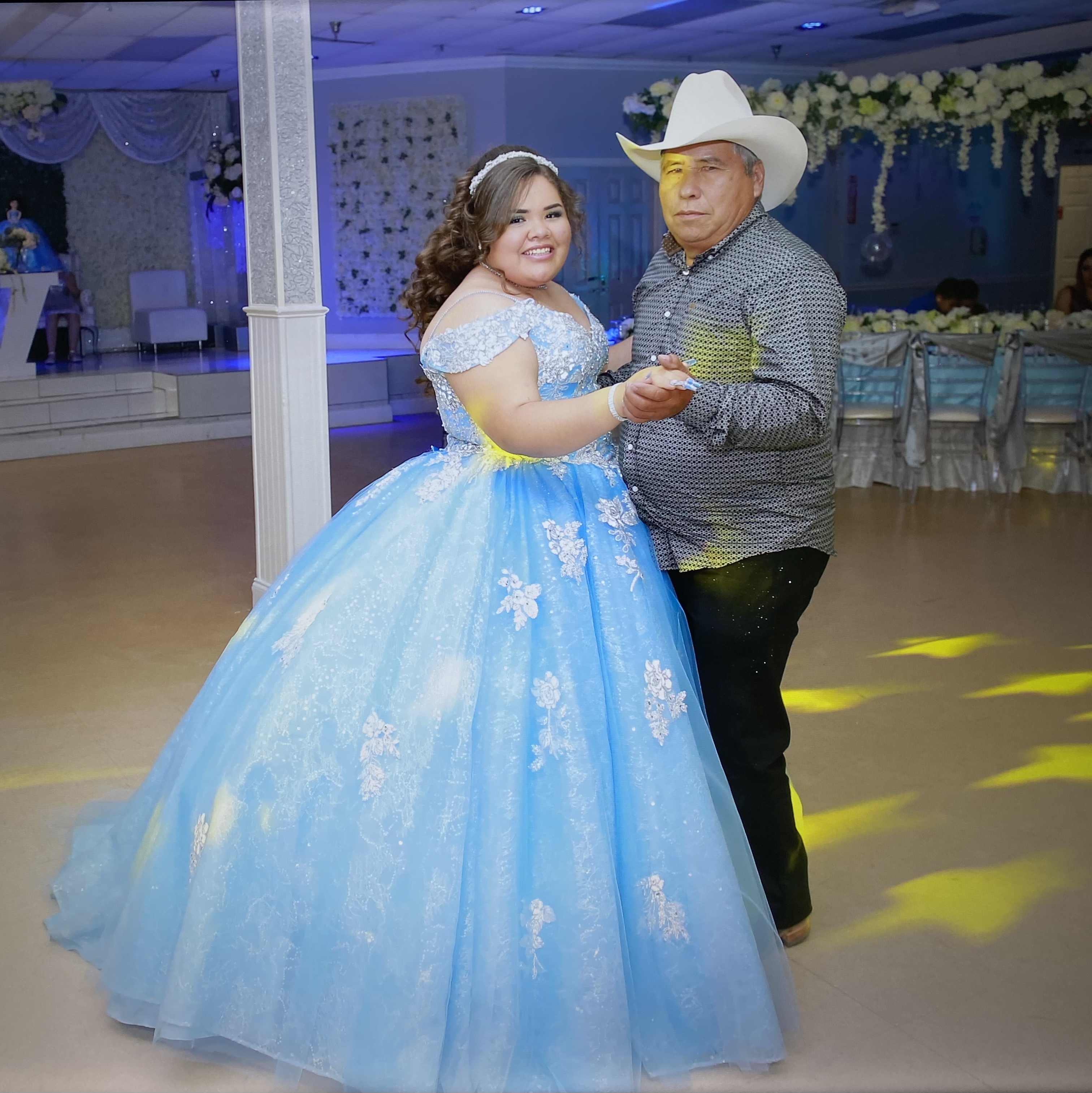 Painted portrait of a father and daughter, the father wears a cowboy hat and tan jacket, the daughter wears a pink quincea?era dress.