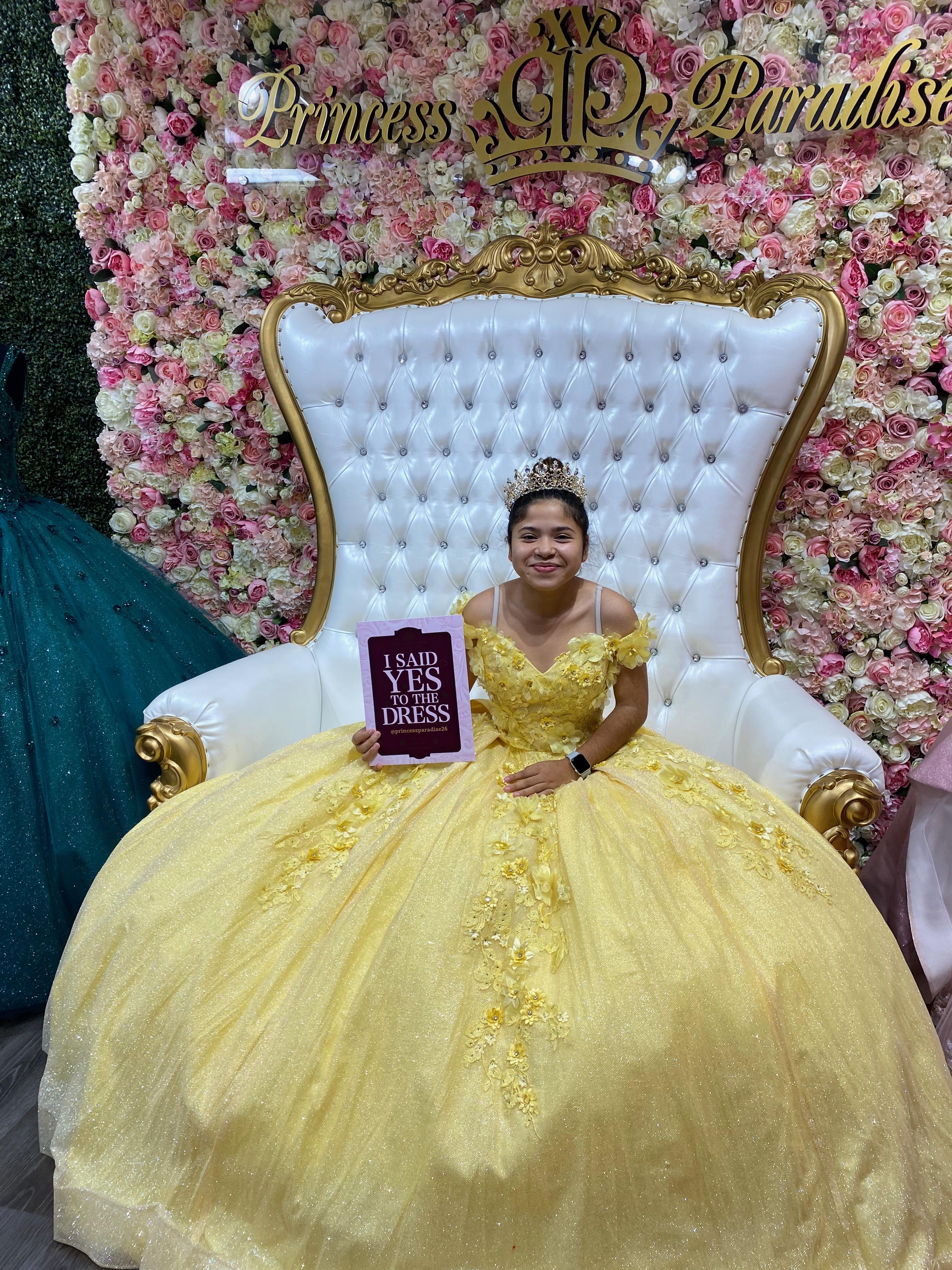 Painting of a man in a suit and a young woman in a yellow dress under a floral arch.