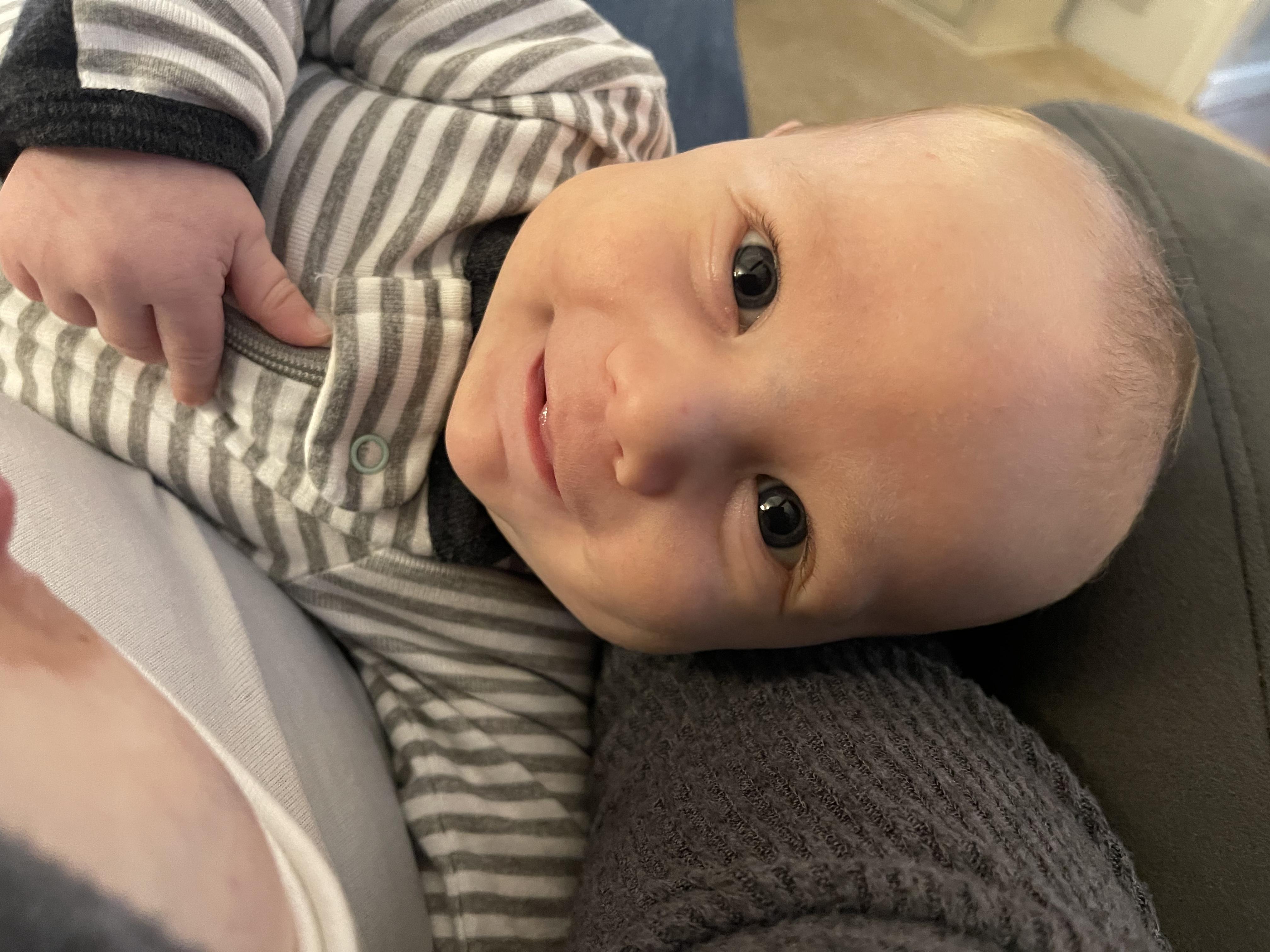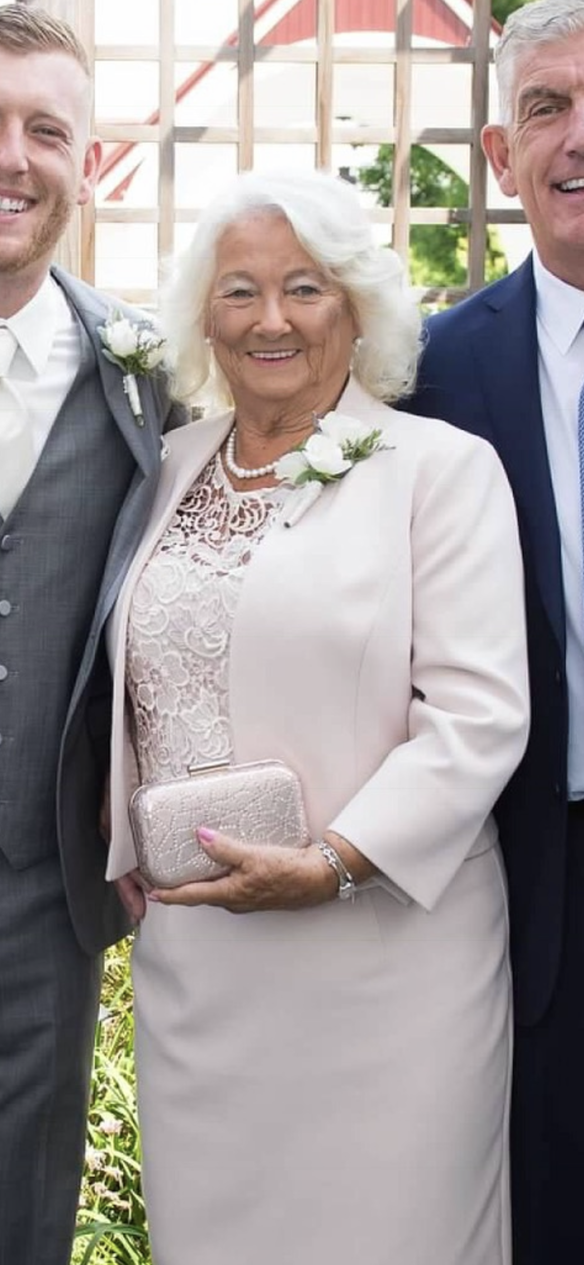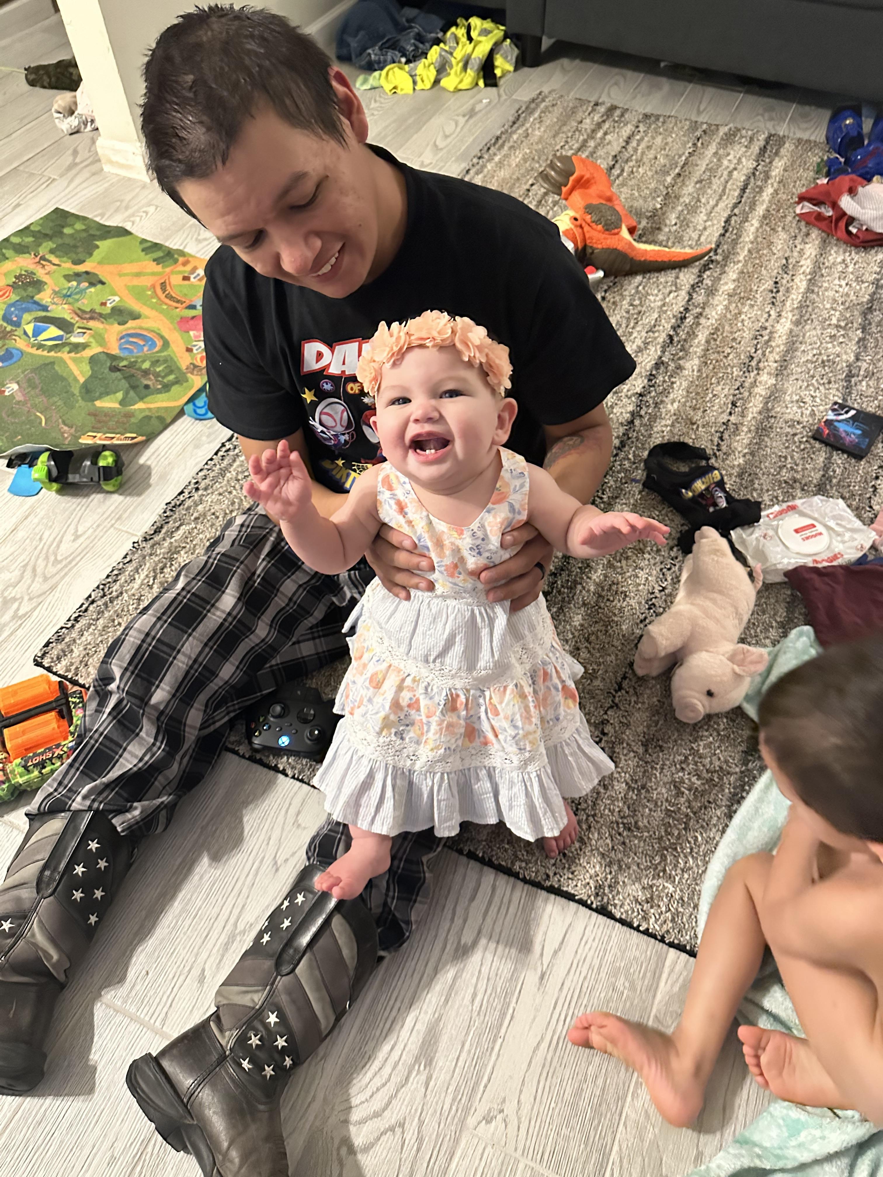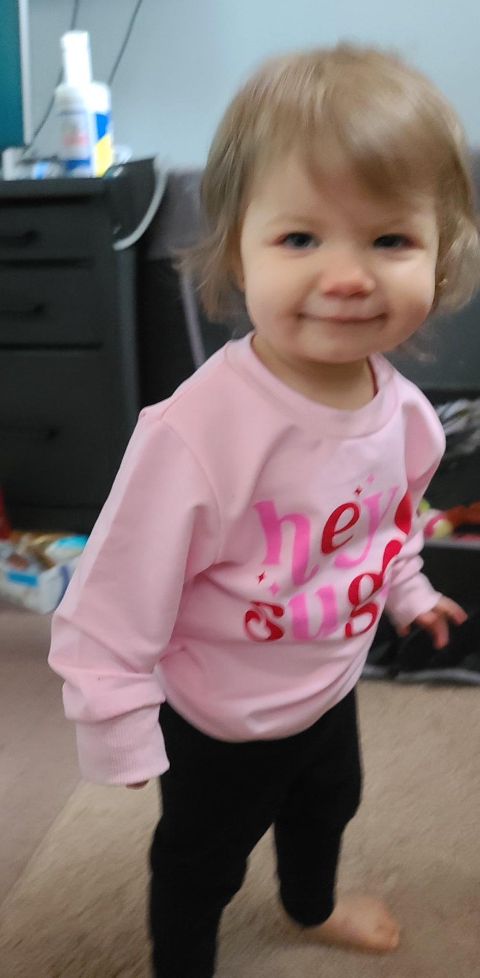 Oil painting portrait of two older adults and a toddler, one adult wearing a grey sweatshirt with a yellow logo.