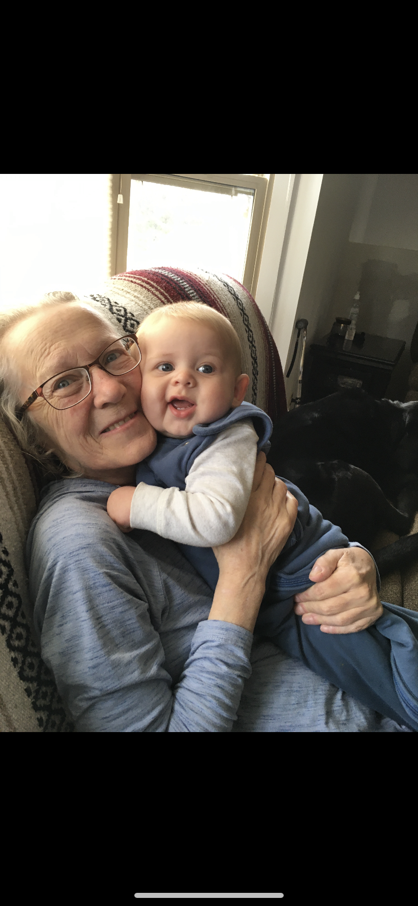 Painting of a smiling grandfather holding a sleeping baby.