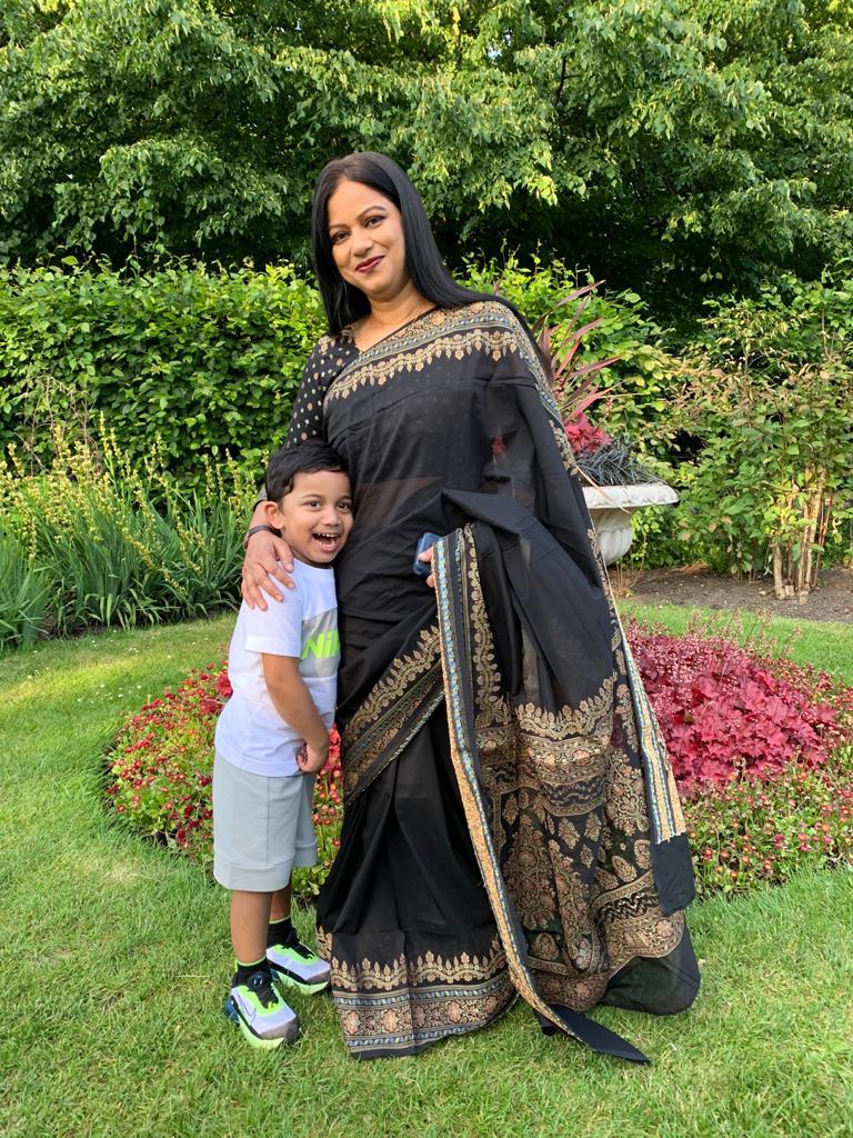 Painting of a smiling woman in a black sari hugging a young boy in a garden.