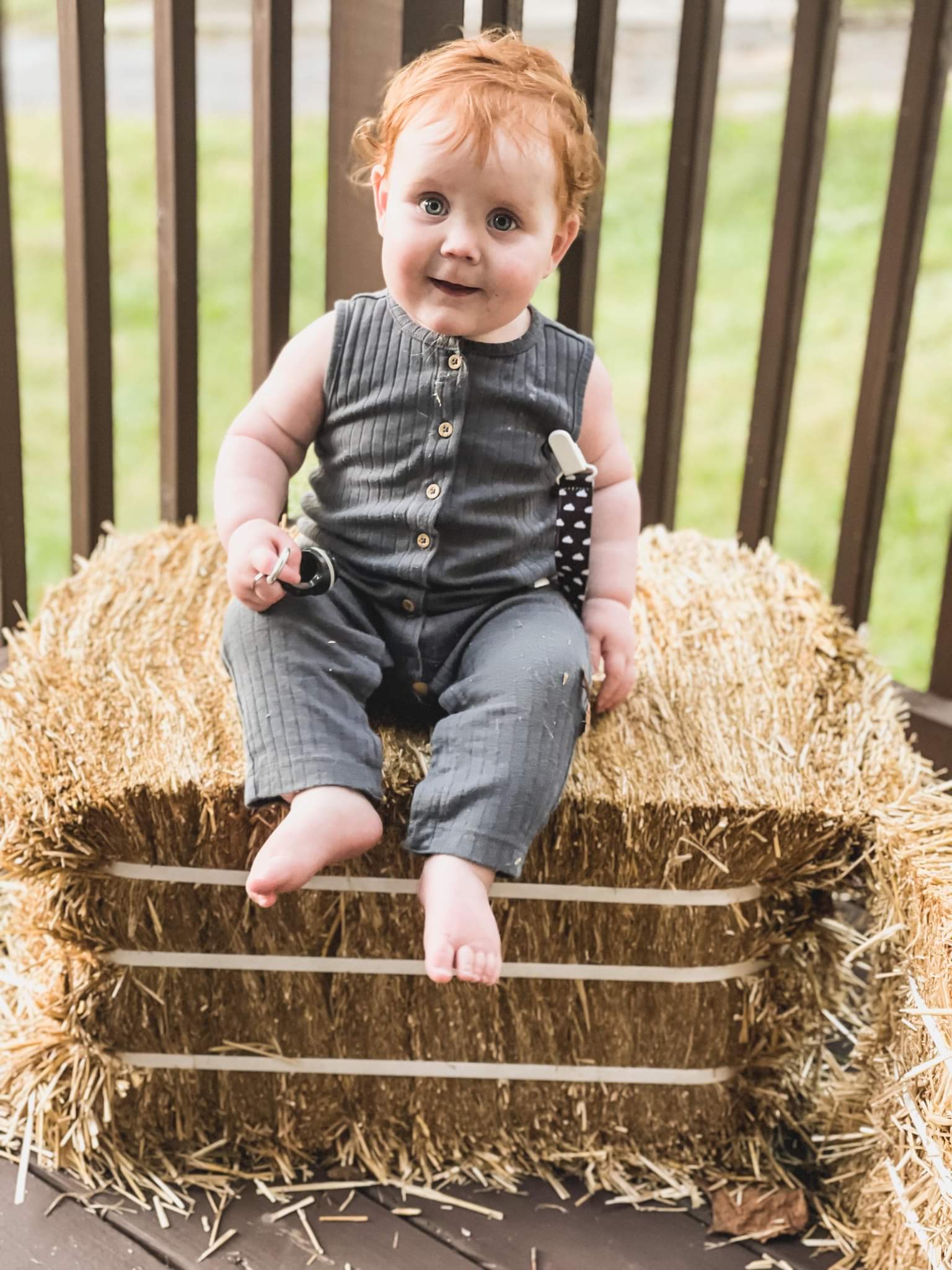 Painting of an elderly man in a cowboy hat holding a smiling toddler.