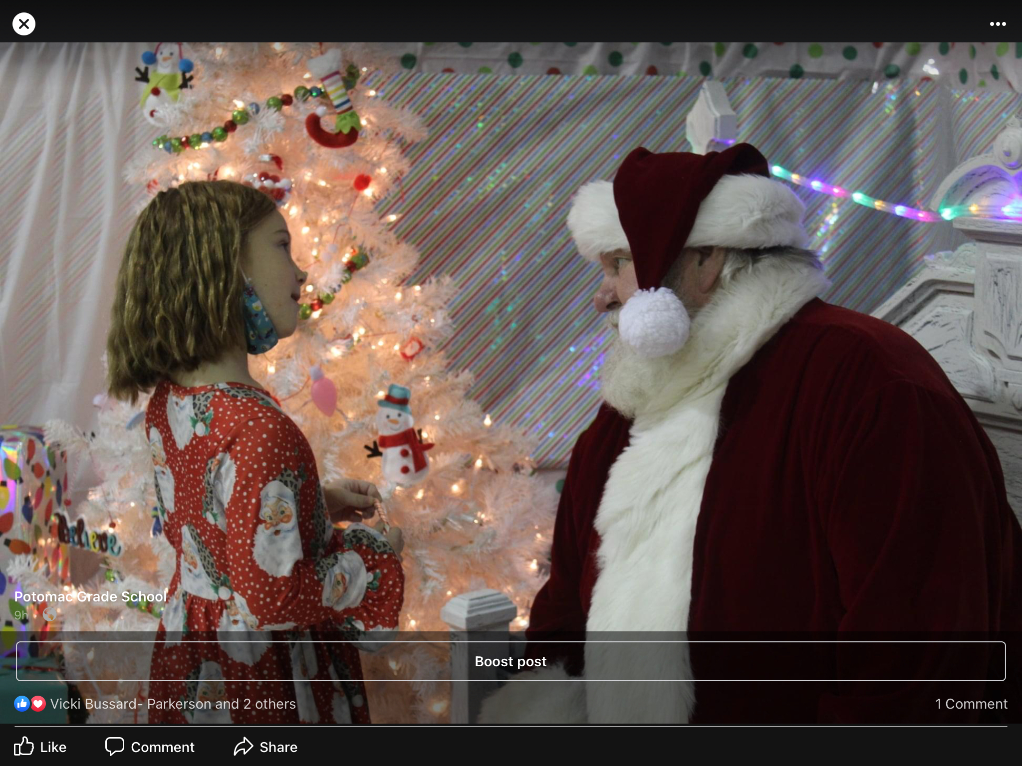 Girl in Santa pajamas near a white Christmas tree, facing Santa Claus.