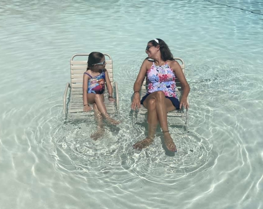 Painting of a woman and child sitting in beach chairs in shallow water.
