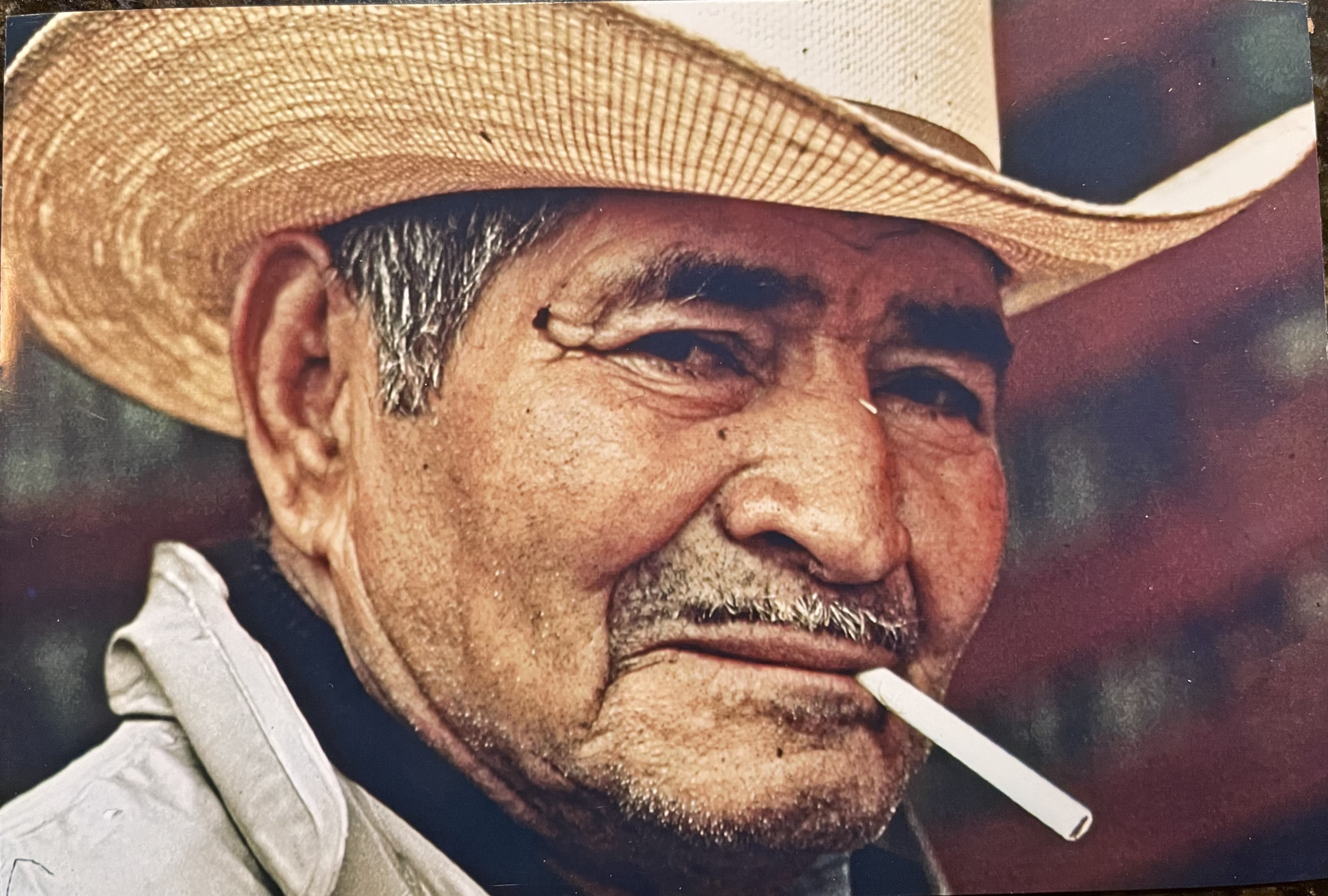 Portrait of an elderly man in a straw cowboy hat, smoking a cigarette.