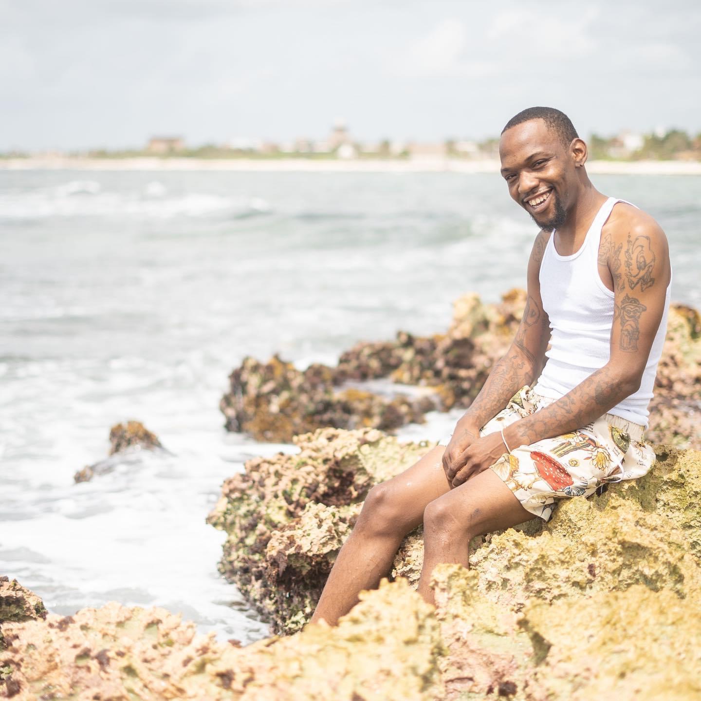 Painting of Avian, smiling and sitting on rocks by the ocean, text reads Forever in our hearts
