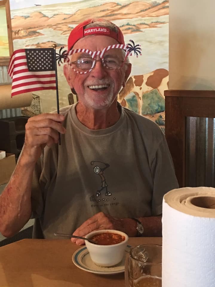 Portrait of a smiling man wearing a Maryland hat, patriotic glasses, and holding a small American flag.