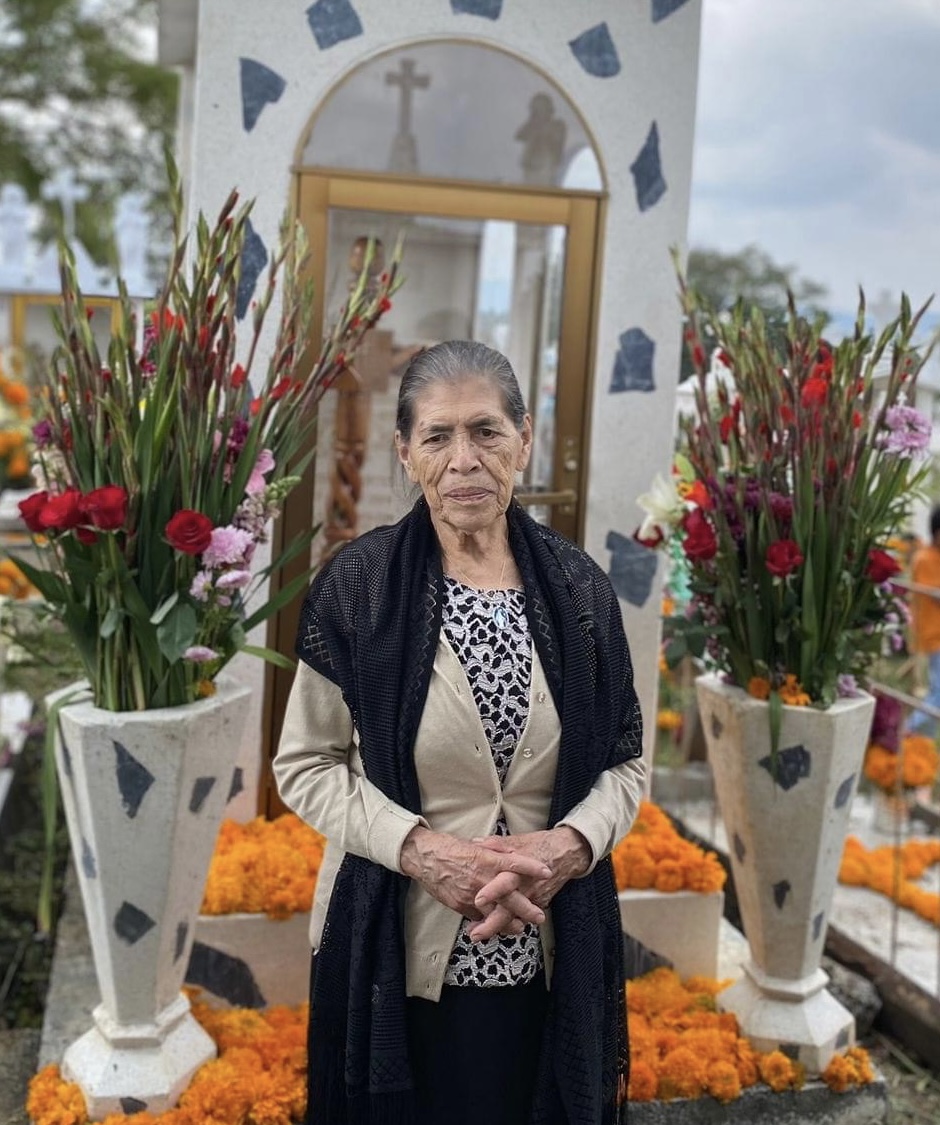 Painting of an elderly woman standing before a chapel, flanked by vases of flowers.
