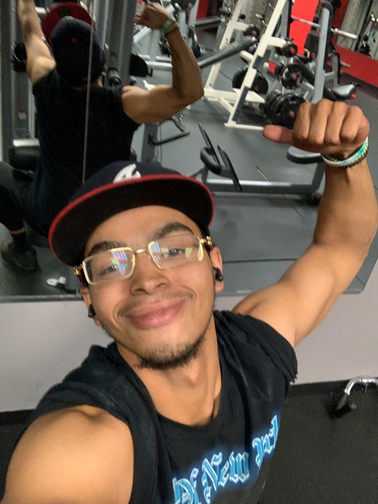 Portrait of a smiling young man wearing glasses and a baseball cap, arm raised in a selfie pose, with a blurred gym background.