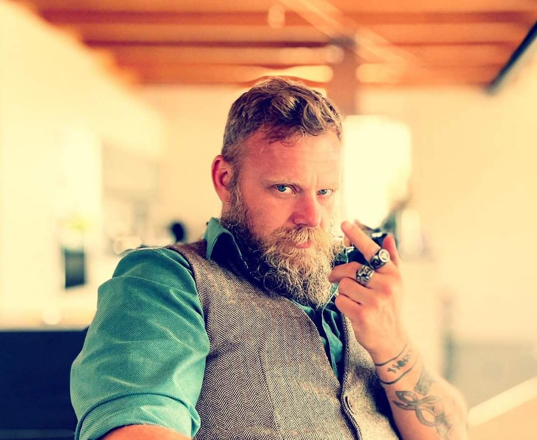 Painting of a man with blue eyes, a long beard, and multiple rings on one hand.