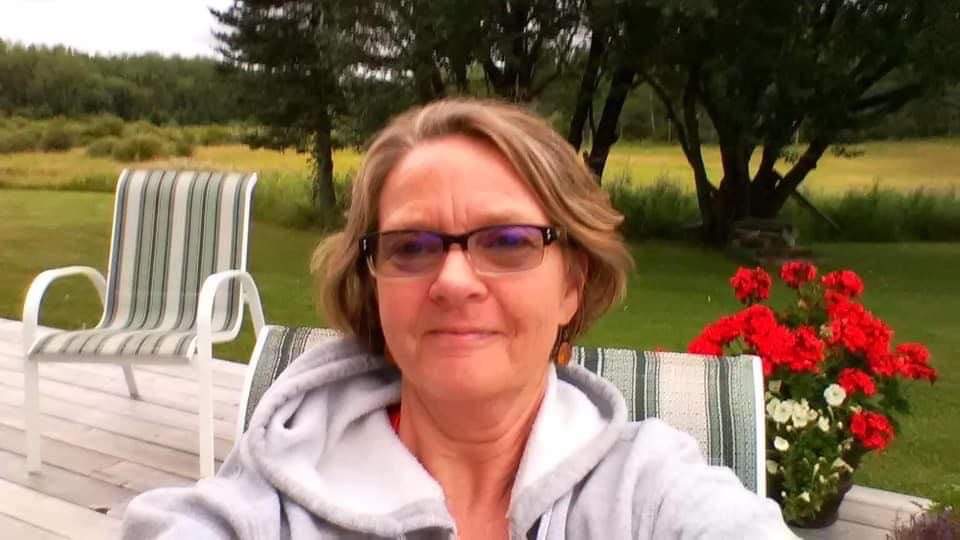 Portrait painting of a woman wearing glasses against a sunset background.