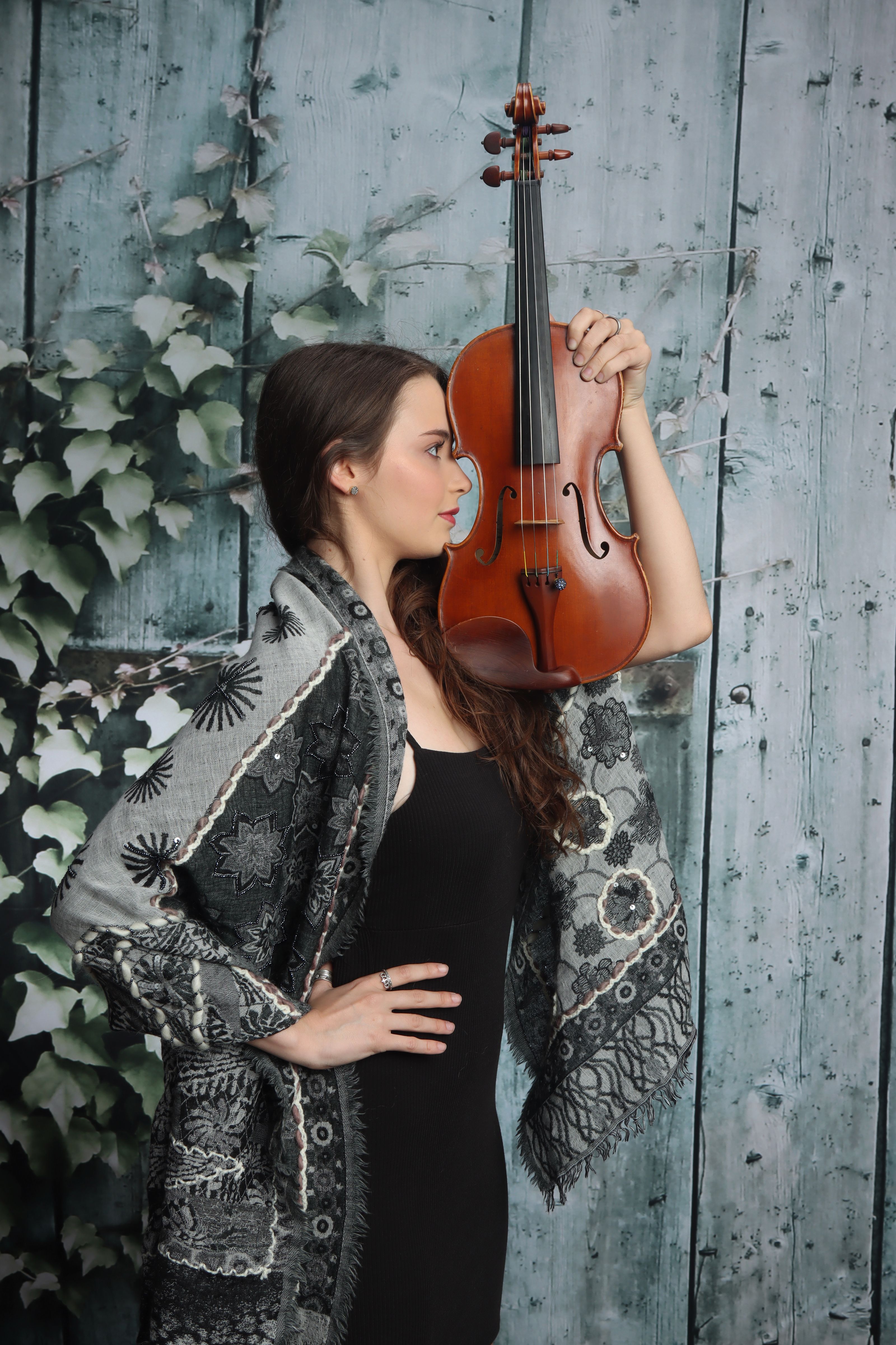 Painting of a woman in profile holding a violin against a weathered wooden door.