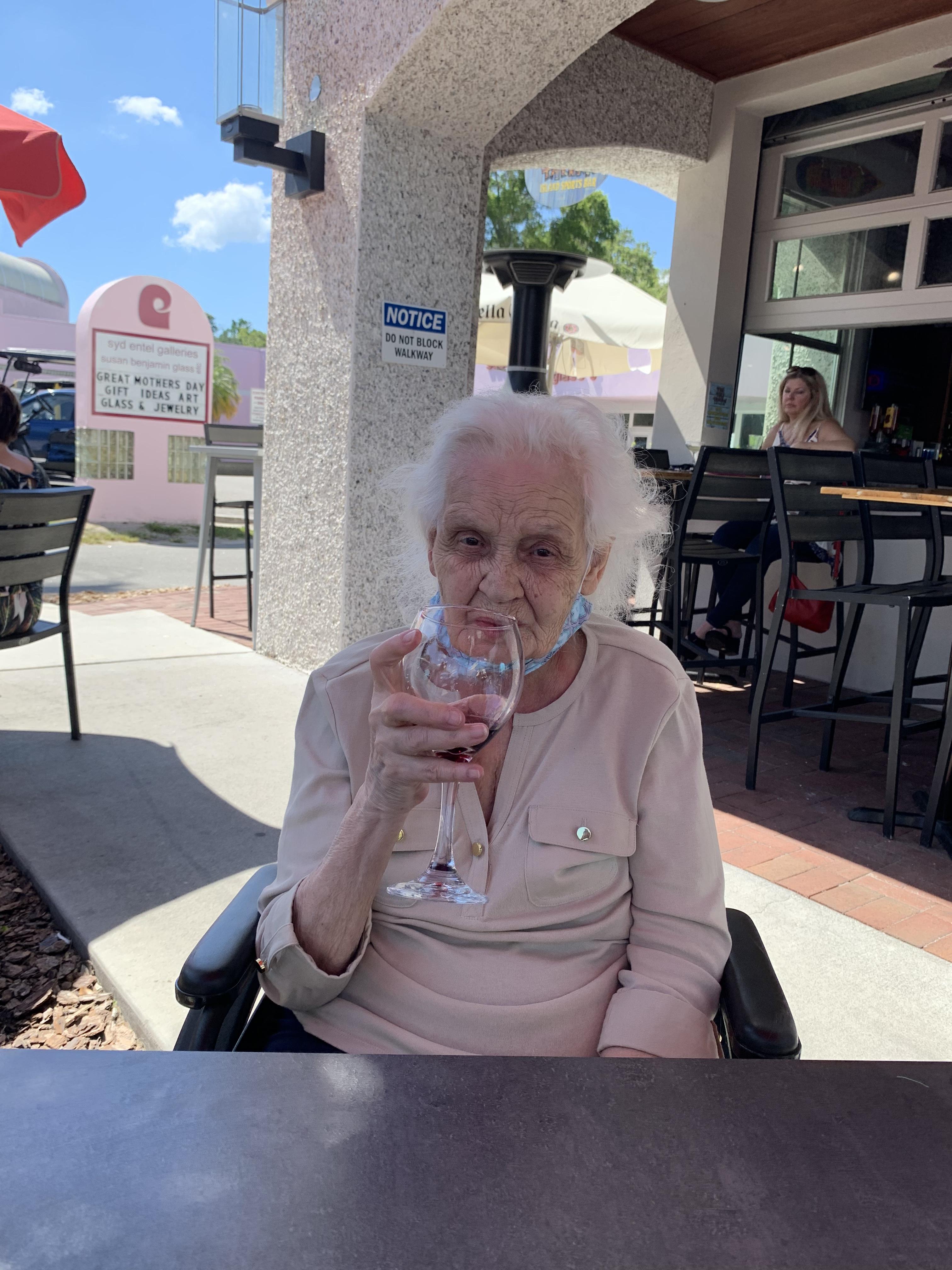 Painting of an elderly woman with white hair drinking red wine.