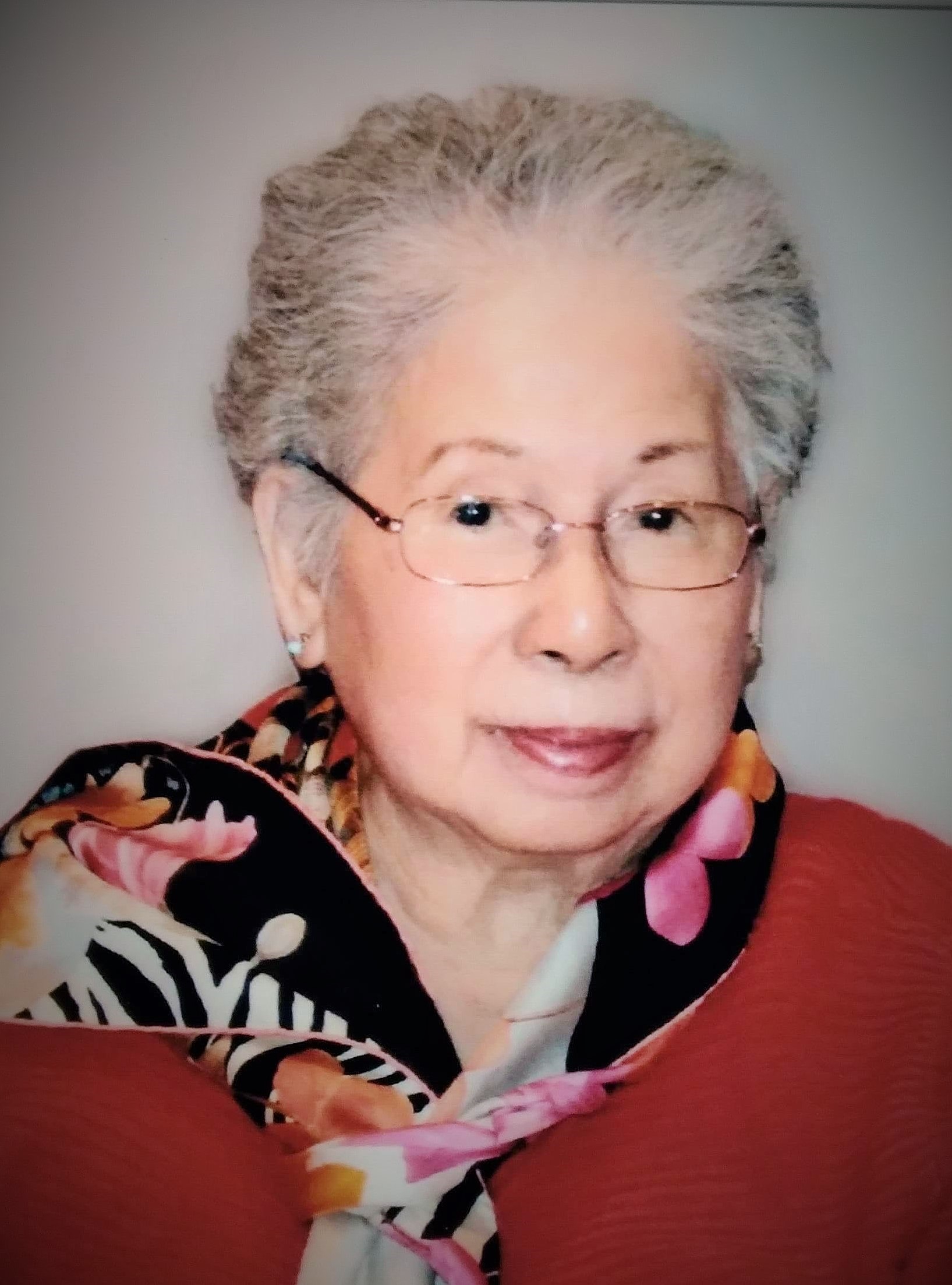 Portrait of an elderly woman with gray hair wearing glasses and a patterned scarf.