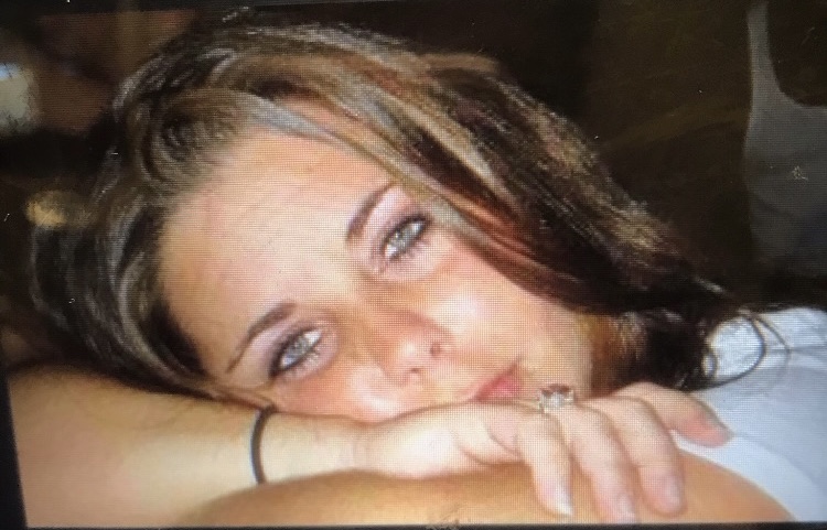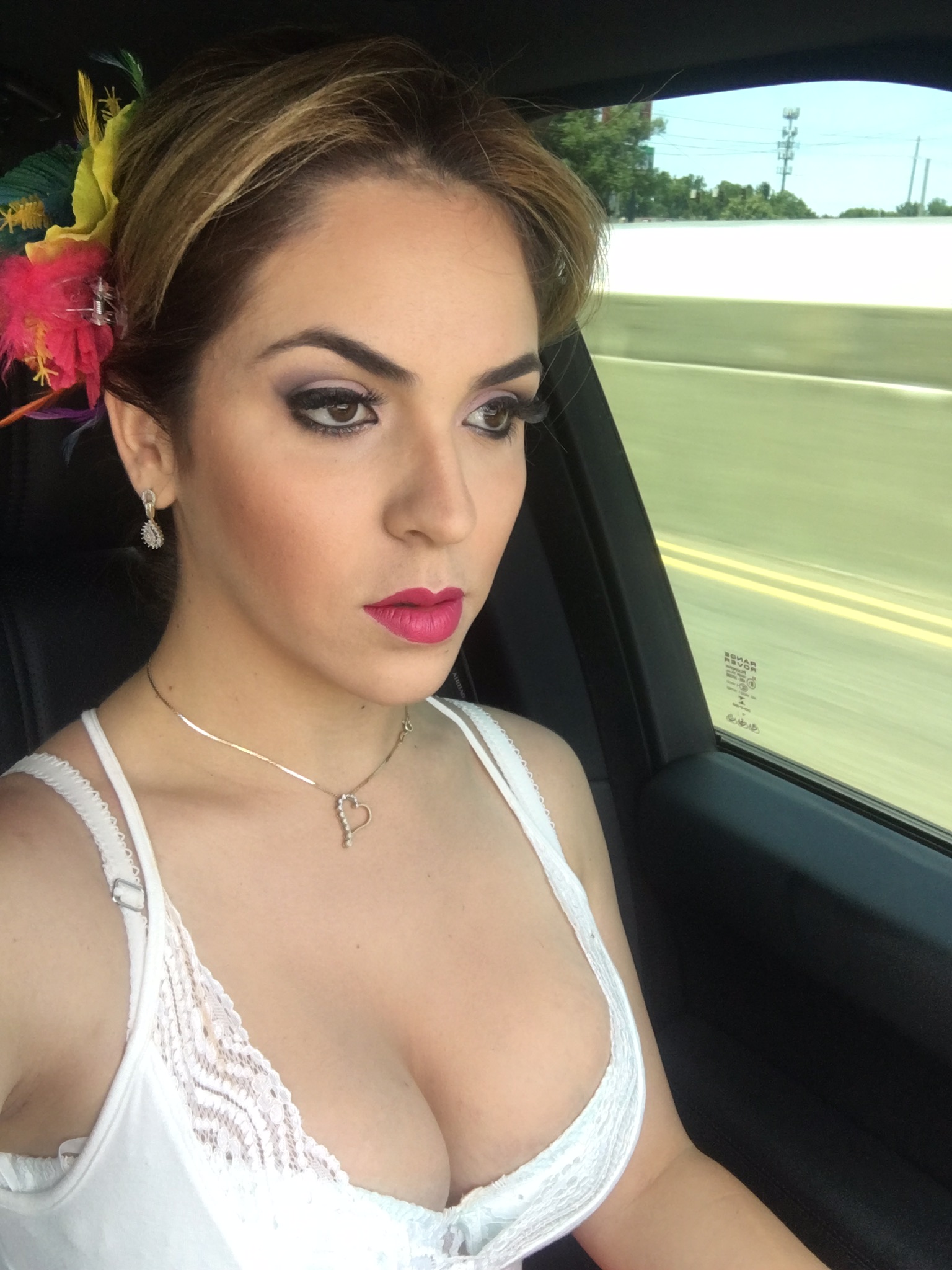 Portrait of a woman in a car, wearing a white top and a flower in her hair.