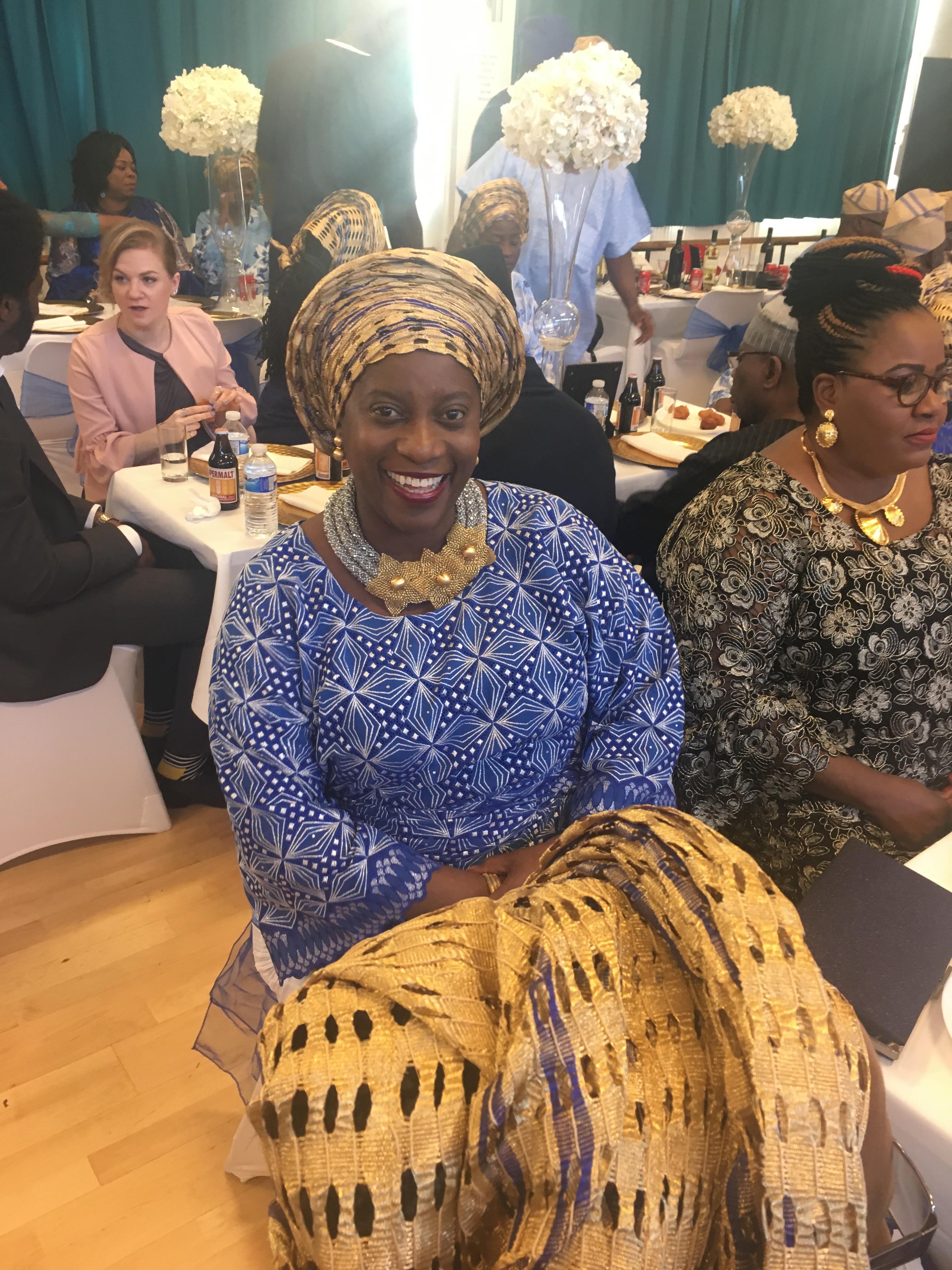 Portrait of a smiling Black woman wearing a yellow headwrap and blue patterned dress.