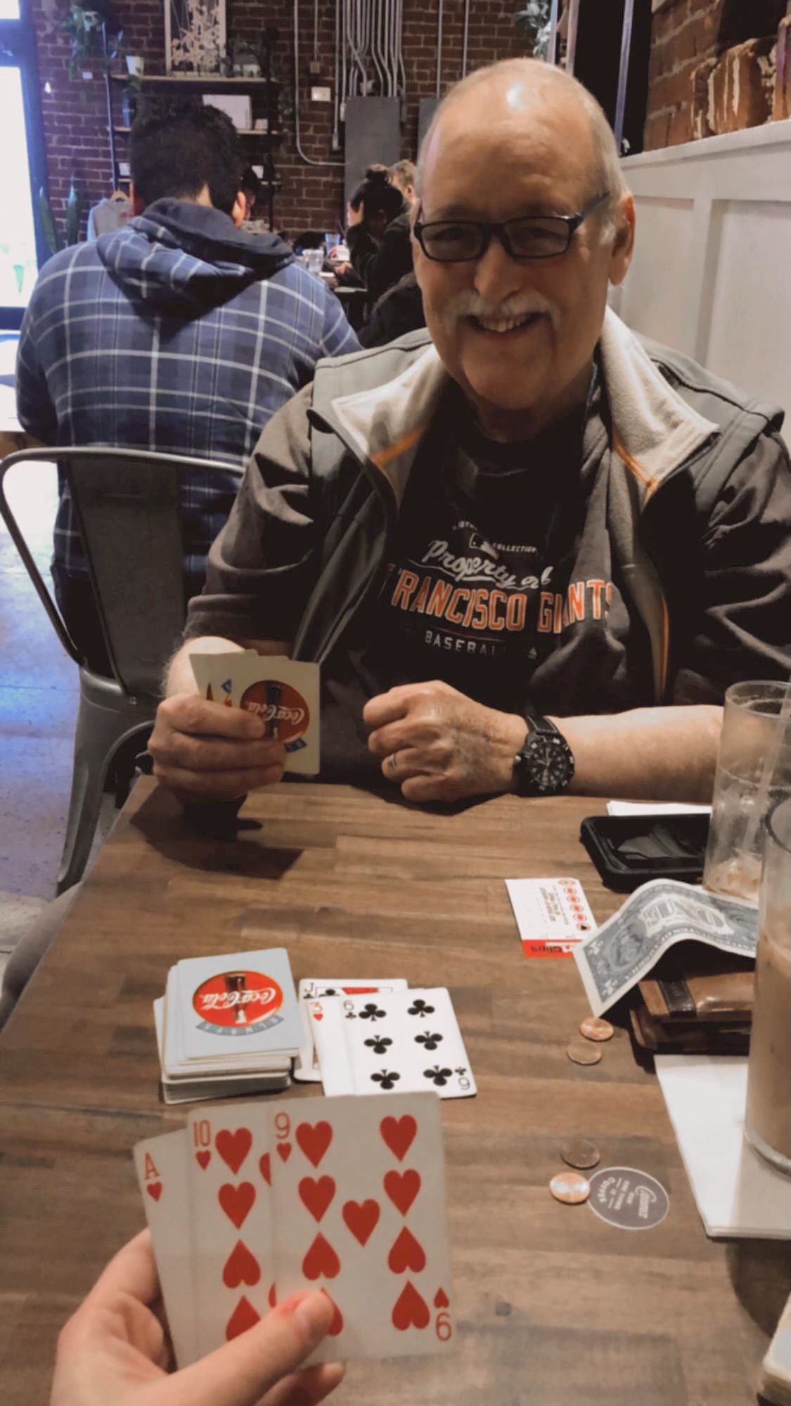 Painting of a smiling man playing cards in a restaurant.