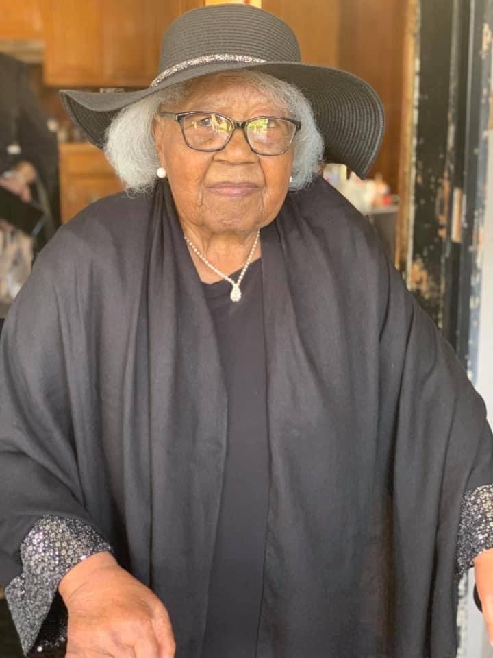 Portrait of an elderly Black woman wearing a hat, glasses, and a pearl necklace.