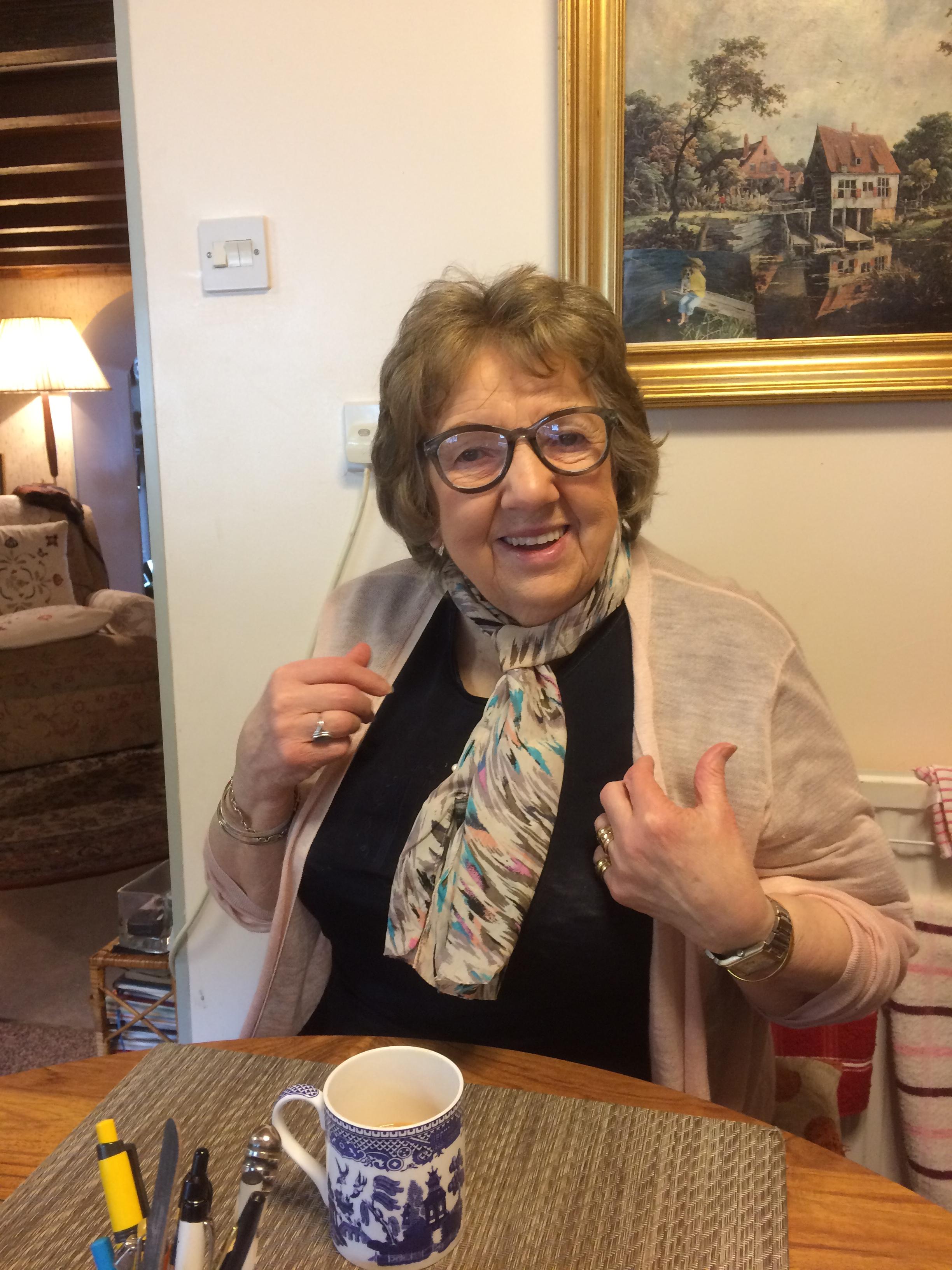 Portrait painting of a smiling woman wearing glasses and a patterned scarf.