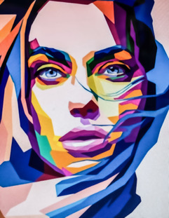 Cubist painting of a woman`s face in shades of blue, yellow, and purple.