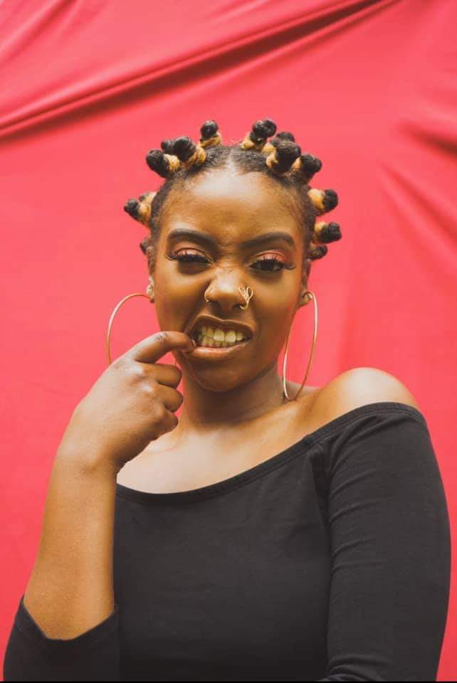 Portrait of a young woman with bantu knots, a nose ring, and hoop earrings, against a red background, she is touching her mouth with a slightly annoyed expression.