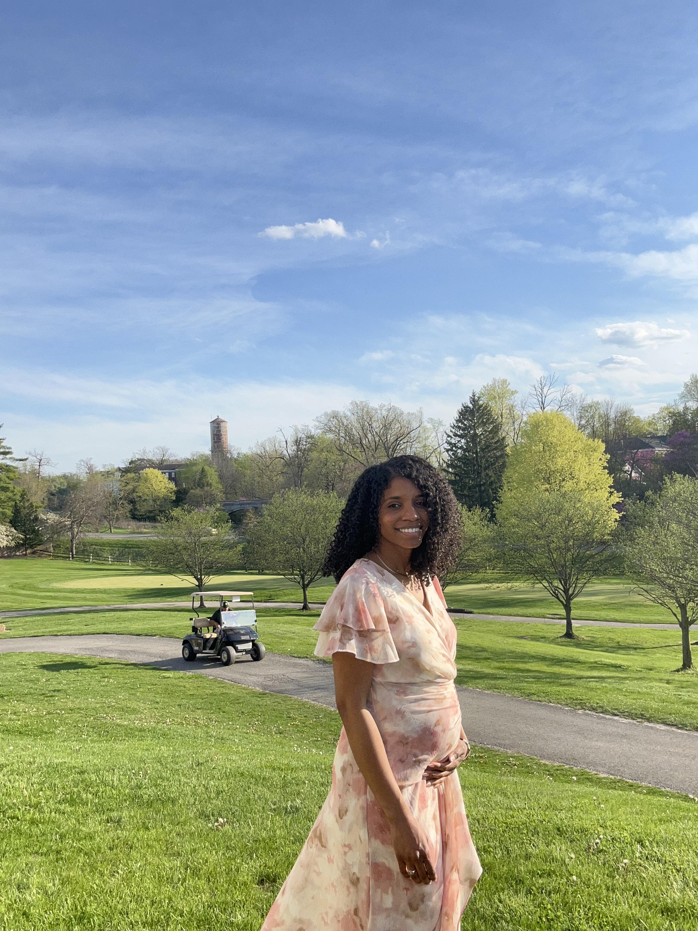 Painting of a smiling pregnant Black woman in a pink dress, outdoors in a park.