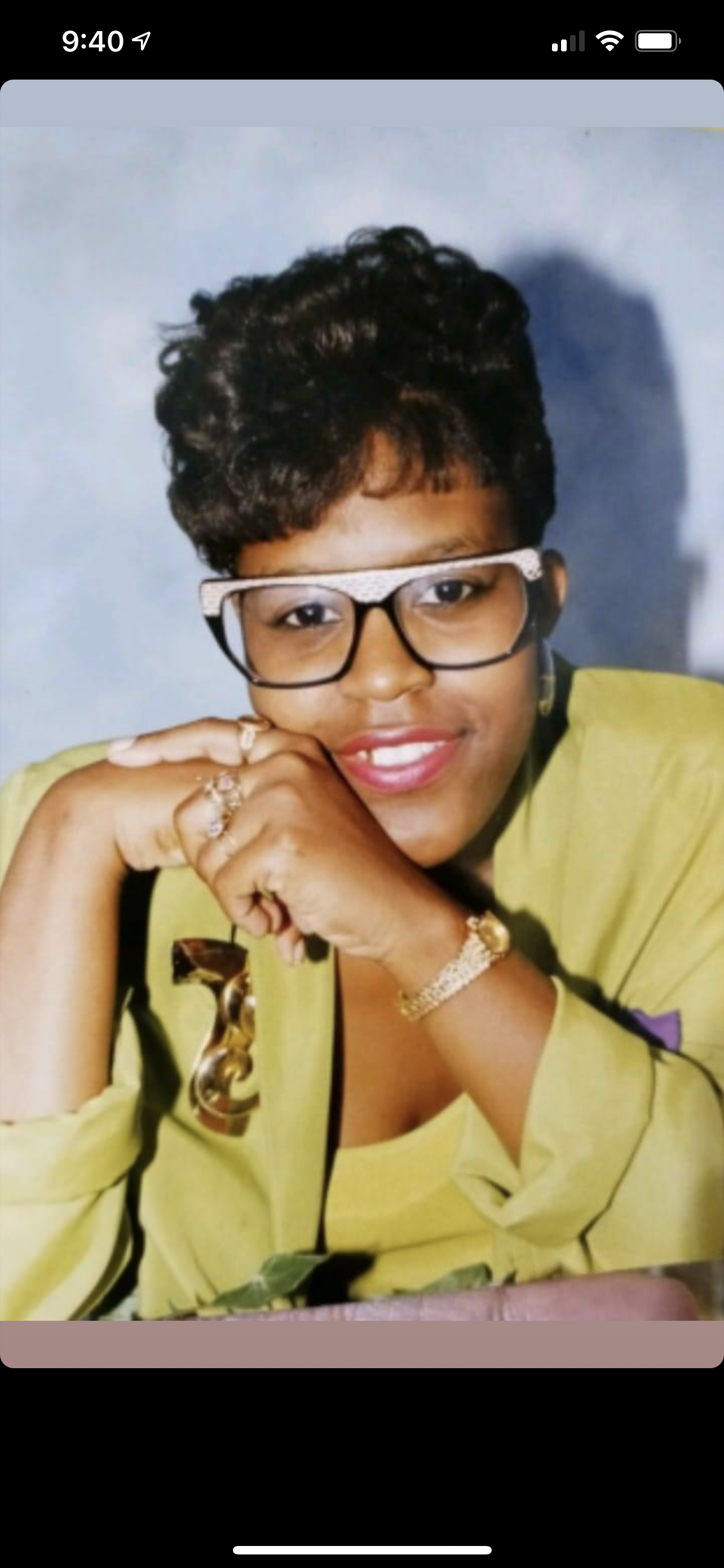 Portrait painting of a smiling Black woman wearing glasses and a lime green jacket.