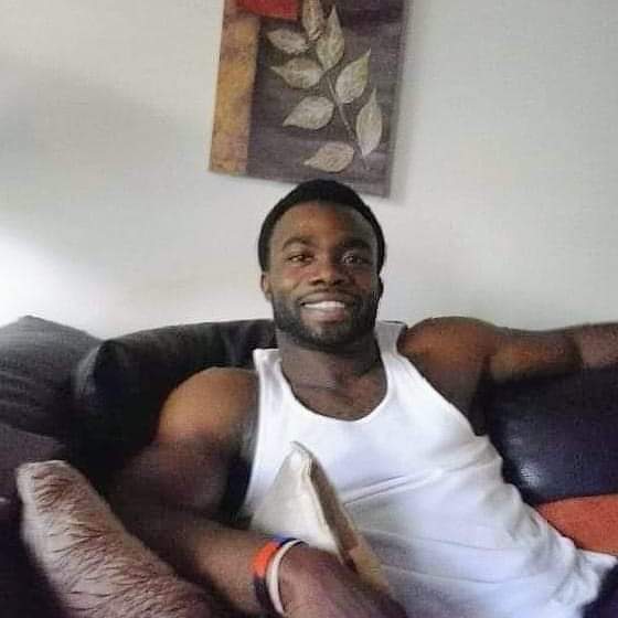 Painting of a smiling Black man in a white tank top sitting on a couch.