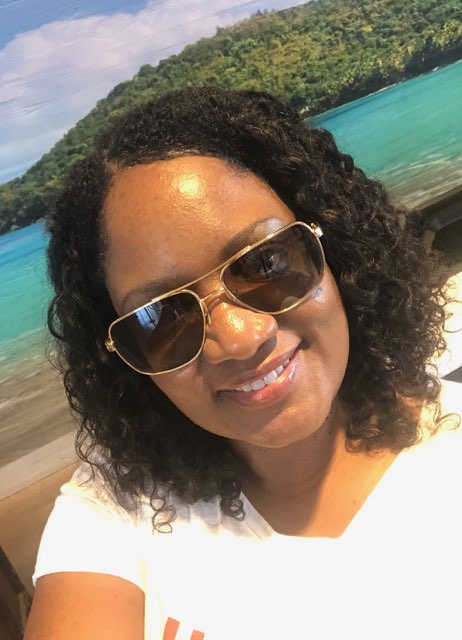 Portrait of a smiling Black woman wearing a green tank top and beaded necklaces, with a lake and green hills in the background.