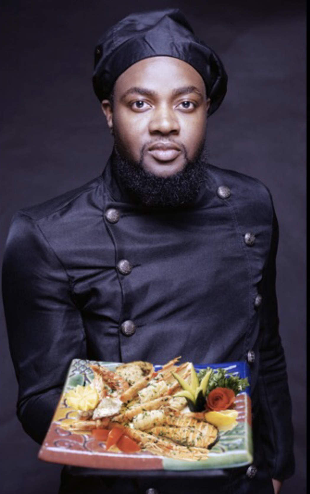 Painting of a man in a dark tunic and head wrap presenting a plate of seafood.